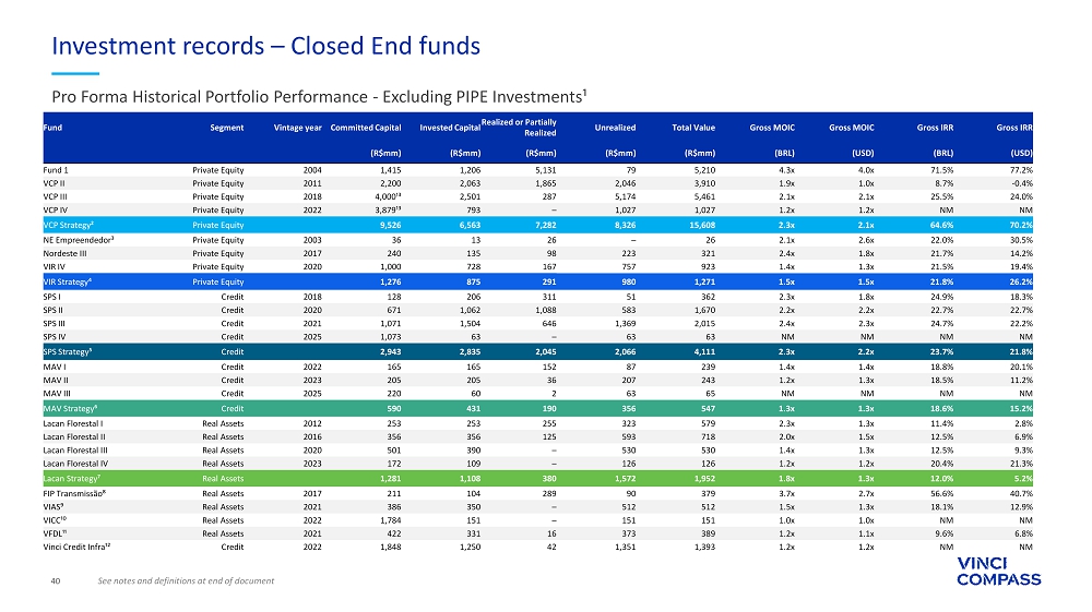40见注和文件投资记录末尾的定义–封闭式基金备考历史投资组合表现-不包括管道投资丨毛IRR毛IRR毛MOIC毛MOIC总值未实现或部分实现投资资本承诺资本年份分部基金(美元)(BRL)(USD)(BRL)(BRL)(R $ mm)(R $ mm)(R $ mm)(R $ mm)77.2% 71.5% 4.0x 4.3x 5,210795,1311,2061,4152004 Private Equity Fund 1-0.4% 8.7% 1.0x 1.9x 3,9102,0461,8652,0632,2002011 Private Equity VCP III24.0 % 25.5% 2.1x 2.1x 5,4615,1742872,5014,000丨↓ 2018 Private Equity VCP III NM NM 1.2x 1.2x 1,0271,027 – 7933,879 ↓2022 Private Equity VCP IV 70.2% 64.6% 2.1x 2.3x 15,60362003私募NE Empreendor φ 14.2% 21.7% 1.8x 2.4x 3212239881352402017私募Nordeste III 19.4% 21.5% 1.3x 1.4x 9237571677281,0002020私募债VIR IV 26.2% 21.8% 1.5x 1.5x 1,2719802918751,276私募债VIR策略丨18.3% 24.9% 1.8x 2.3x 362513112061282018信贷SPS I 22.7% 22.7% 2.2x 2.2x 1,6705831,0881,0626712020信贷SPS II 22.2% 24.7% 2.3x 2.4x 2,0 151,3696461,5041,0712021信贷SPS III NM NM NM 6363 – 631,0732025信贷SPS IV21.8% 23.7% 2.2x 2.3x 4,1112,0662,0452,8352,943信贷SPS策略20.1% 18.8% 1.4x 1.4x 239871521651652022信贷MAV I 11.2% 18.5% 1.3x 1.2x 243207362052023信贷MAV II NM NM NM 65632602202025信贷MAV III 15.2% 18.6% 1.3x 1.3x 547356190431590信贷MAV策略2.8% 11.4% 1.3x 2.3x 5793232552532532012实物资产Lacan Florestal I 6.9% 12.5% 1.5x 2.0x 7185931253563562016实物资产Lacan Florestal II 9.3% 12.5% 1.3x 1.4x 530530– 3905012020 Real Assets Lacan Florestal III 21.3% 20.4% 1.2x 1.2x 126126 – 1091722023 Real Assets Lacan Florestal IV 5.2% 12.0% 1.3x 1.8x 1,9521,5723801,1081,281 Real Assets Lacan Strategy 40.7% 56.6% 2.7x 3.7x 379902891042112017 Real Assets FIP Transmiss ã o丨12.9% 18.1% 1.3x 1.5x 512512 – 3503862021 Real Assets VIAS NM NM 1.0x 1.0x 151151 – 1511,7842022 Real Assets VICC Sez6.8% 9.6% 1.1x 1.2x 389373163314222021 Real Assets VFDL Sez21 NM NM 1.2x 1.21,8482022 Credit Vinci Credit Infra丨²