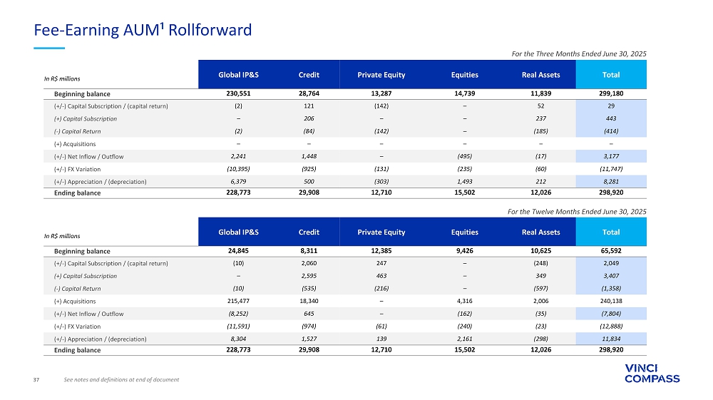 36见附注和文件末尾的定义AUM丨滚存总实物资产股权私募股权信贷全球IP & S百万雷亚尔304,55211,96514,79316,48129,389231,924期初余额(18)23 –(161)121(2)(+/-)资本认购/(资本回报)443237 – – 2060(+)资本认购(461)(214)–(161)(84)(2)(-)资本回报– –– ––(+)收购3,196(17)(505)– 1,4422,276(+/-)净流入/流出(11,793)(60)(236)(131)(945)(10,421)(+/-)外汇变化8,1202131,500(420)4516,377(+/-)升值/(贬值)304,05712,12315,55215,76930,459230,155截至6月30日止三个月的期末余额,2025年实物资产总额股权私募股权信贷全球IP & S(百万雷亚尔)69,21210,6699,46315,5248,49925,057期初余额2,000(277)– 2282,058(10)(+/-)资本认购/(资本回报)3,407349 – 4632,5950(+)资本认购(1,408)(626)–(235)(537)(10)(-)资本回报241,1472,0064,355 – 18,780216,007(+)收购(7,819)(35)(191)– 577(8,171)(+/-)净流入/流出(12,938)(23)(241)(61)(995)(11,618)(+/-)外汇变动12,456(216)2,166712,12315,55215,76930,459230,155截至2025年6月30日止十二个月的期末余额