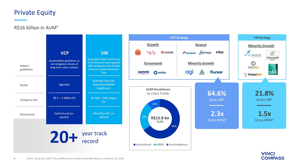 8个160亿雷亚尔AUM丨私募股权2.3x Gross MOIC ² 64.6% Gross IRR ² 158亿雷亚尔AUM & UHDWHG E \& KDQXW LV、QGXVWULHV IURP WKH 1RXQ 3URMHFW & UHDWHG E \' LQRVRIW/DEV IURP WKH 1RXQ 3URMHFW VIR VCP影响指南行业公司规模治理可持续性指南作为长期价值创造的风险缓释驱动因素不可知论10-20亿雷亚尔EV控制和共同控制商业服务专业零售医疗保健1亿– 5亿雷亚尔EV少数群体与共同控制产生业务核心影响,并支持获得资本有限的中小企业并且知道-如何20 + 1.5x Gross MOIC ² 21.8% Gross IRR ²年度业绩记录买断增长扭亏为盈少数群体增长VCP战略说明:丨截至2025年6月;²截至2025年3月31日,以巴西里亚斯计算的总IRR和总MOIC。扭亏为盈VIR策略少数派增长65% 24% 11% AUM按客户资料分机构高净值人士中介