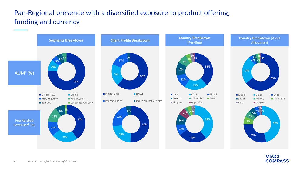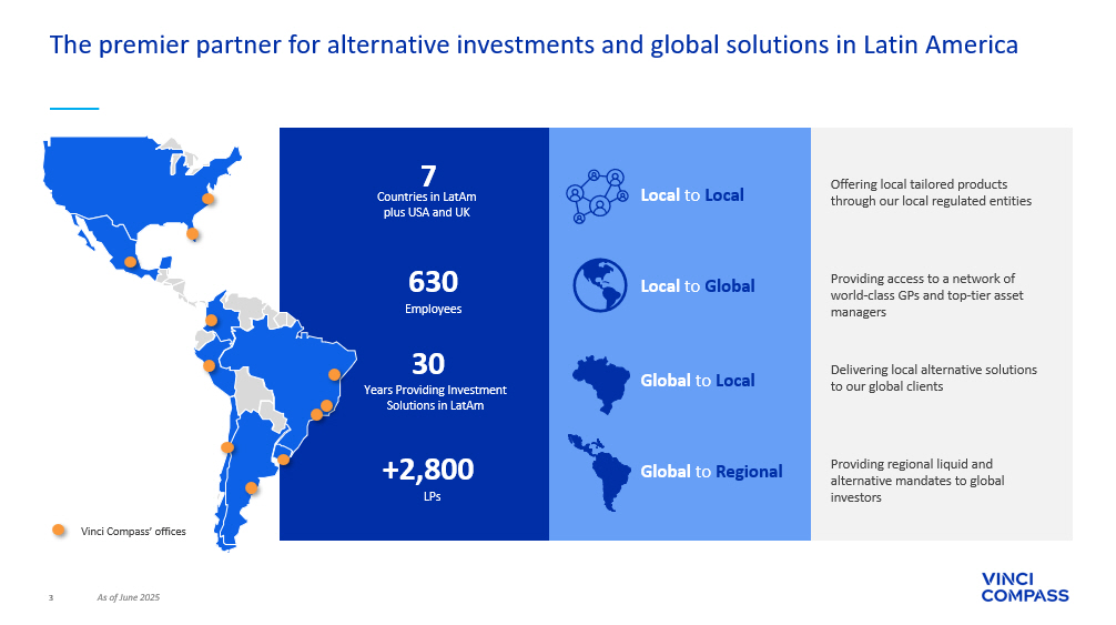3截至2025年6月拉丁美洲另类投资和全球解决方案的首要合作伙伴Vinci Compass的办公室630名员工LP Global to Local Local to Global Local to Global Local to Local Global to Regional Years Providing Investment Solutions in LatAm 7 countries in LatAm plus USA and UK通过我们的当地受监管实体提供当地定制的产品为我们的全球客户提供当地替代解决方案,提供对世界级GP和顶级资产管理公司网络的访问,为全球投资者提供区域流动性和替代授权+ 25 + 2,800