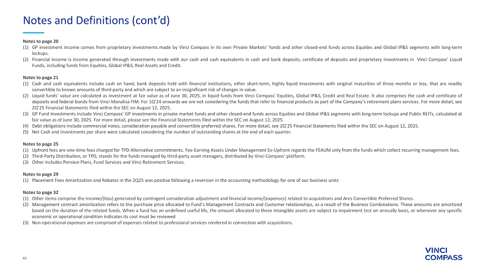 43第20页注释(1)GP投资收益来自Vinci Compass对其自己的Private Markets基金和其他封闭式基金进行的自营投资,涉及股票和全球IP & S领域,并存在长期锁定。(2)财务收入是通过使用我们的现金和现金等价物进行的投资产生的收入,包括现金和银行存款、存款证以及对Vinci Compass的流动资金的自营投资,包括来自股票、全球知识产权、实物资产和信贷的资金。第21页附注(1)现金及现金等价物包括库存现金、存放于金融机构的银行存款、原到期日为三个月或以下、易于转换为第三方已知金额、价值变动风险很小的其他短期、高流动性投资。(2)流动性资金的价值计算为截至2025年6月30日以公允价值投资于Vinci Compass’Equities、Global IP & S、Credit和Real Estate的流动性资金。它还包括现金和存款证以及Vinci Monalisa FIM的联邦债券。从24年第一季度开始,我们不考虑将金融产品称为公司退休计划服务的一部分的基金。有关更多详细信息,请参阅2025年8月12日在SEC提交的2 Q'25财务报表。(3)GP基金投资包括Vinci Compass对私募市场基金和其他封闭式基金的GP投资,涉及股票和全球IP & S领域的长期锁定和公共REITs,按截至2025年6月30日的公允价值计算。欲了解更多详情,请参阅美国证券交易委员会于2025年8月12日提交的财务报表。(4)债务义务包括商业票据、应付对价和可转换优先股。有关更多详细信息,请参见2025年8月12日在SEC提交的2 Q'25财务报表。(5)考虑每个季度末的流通股数量计算每股净现金和投资。第25页注释(1)前期费用是针对TPD替代承诺收取的一次性费用。管理下的收费-赚取资产EX-Upfront仅将FEAUM从收取经常性管理费的基金中考虑。(2)第三方分销(Third Party Distribution),即TPD,是指由第三方资产管理公司管理的资金,由Vinci Compass的平台进行分销。(3)其他包括养老金计划、基金服务和Vinci退休服务。第29页附注(1)在我们的一个业务部门的会计方法发生调整后,第二季度25的配售费摊销和回扣为正值第32页附注(1)其他项目包括或有对价调整产生的收入/(亏损)以及与收购和Ares可转换优先股相关的财务收入/(费用)。(2)管理合同摊销是指分配给基金的管理合同和客户关系的购买价格,是业务合并的结果。这些金额根据相关资金的存续期进行摊销。当基金的使用寿命不确定时,分配给这些无形资产的金额每年进行减值测试,或每当任何特定的经济或运营状况表明其成本必须进行审查时(3)非运营费用包括与收购相关的专业服务相关的费用。注释和定义(续)