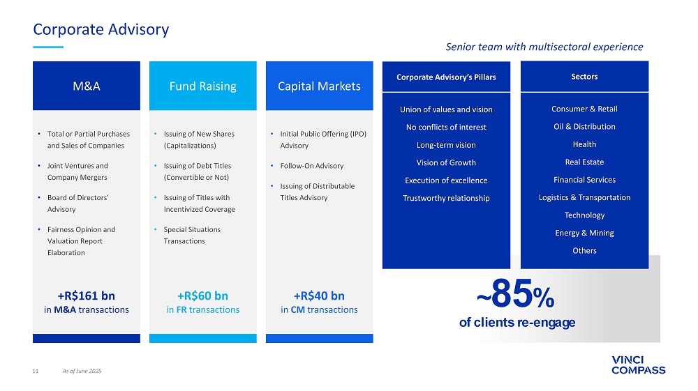 10实物资产•投资于主要房地产领域•巴西股市七个上市REITs •在巴西、乌拉圭和秘鲁设有封闭式基金的机会型开发商t策略•专注于巴西的关键基础设施主题:电力、水和环卫以及运输和物流•六个结构性基金和一个永久上市工具• VICC,我们的第9条合规基金,目前正在筹资•战略包括在巴西设有桉树、松树和原生森林的绿地和棕地项目•自2009年以来筹集的三个年份,目前正在筹集第四笔资金并正在成为第9条•碳信用额在传统林业收入之上提供了巨大的回报潜力巴西净种植面积为13万公顷+ 56万投资者38家公司/资产我们AUM中的121亿雷亚尔AUM在10年以上锁定期的车辆中~82%林业18亿雷亚尔房地产65亿雷亚尔基础设施39亿雷亚尔120亿雷亚尔AUM截至2025年6月44% 44% 44% 8% 4% AUM按客户简介公共市场载体机构高净值中介机构细分