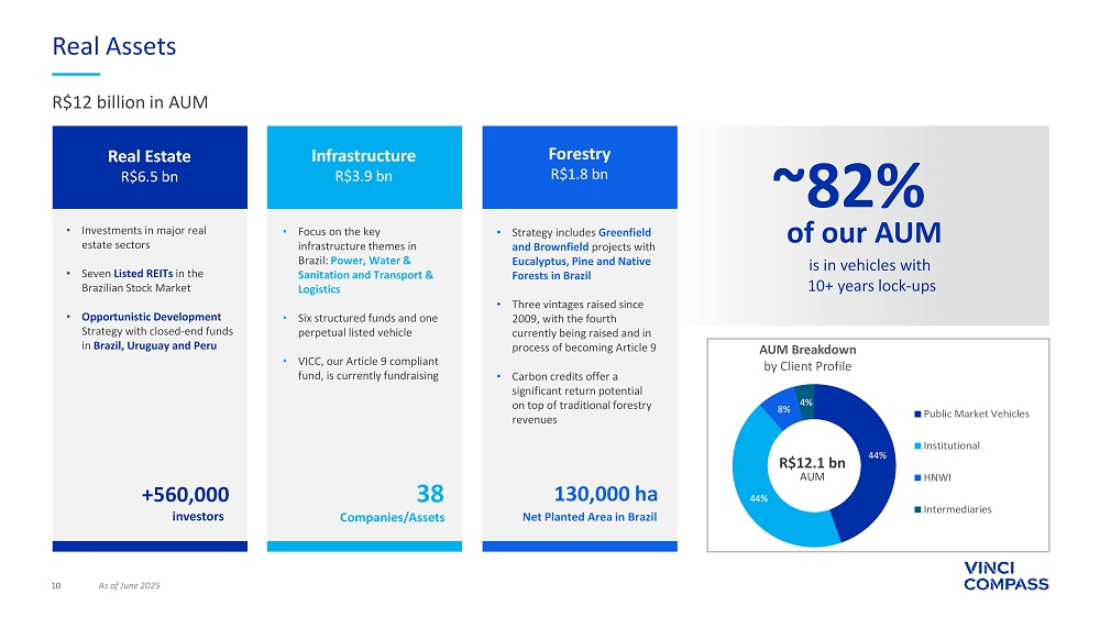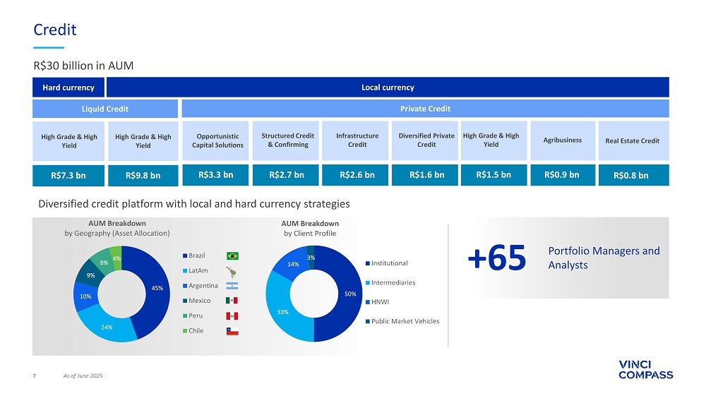 745% 24% 10% 9% 8% 4%按地域划分的AUM(资产配置)巴西拉美阿根廷墨西哥秘鲁智利信贷多元化信贷平台,具有本地和硬通货策略+ 65名投资组合经理和分析师截至2025年6月的AUM为300亿雷亚尔本币私人信贷高等级和高收益98亿雷亚尔硬通货流动性信贷高等级和高收益70亿雷亚尔高等级和高收益1雷亚尔。50亿元50% 33% 14% 3% AUM按客户情况划分机构中介机构HNWI公共市场工具结构性信贷&确认27亿雷亚尔基础设施信贷26亿雷亚尔多元化私人信贷16亿雷亚尔房地产信贷8亿雷亚尔机会主义资本解决方案33亿雷亚尔农业综合企业9亿雷亚尔