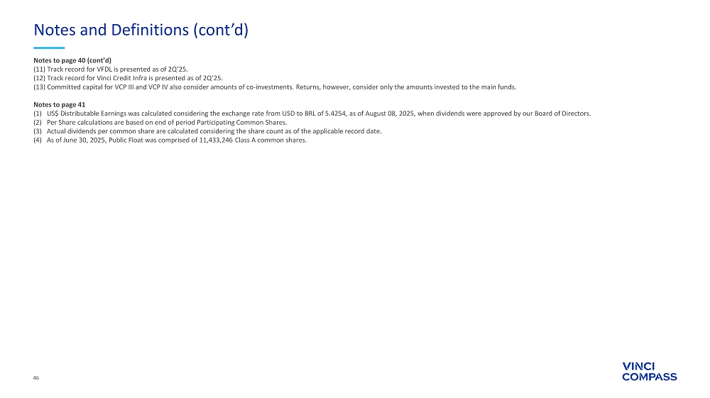46第40页(续)(11)的注释VFDL的往绩记录截至2 Q'25。(12)Vinci Credit Infra的往绩记录截至2 Q'25。(13)VCP III和VCP IV的承诺资本也考虑共同投资的金额。然而,回报只考虑投资于主力资金的金额。第41页附注(1)美元可分配收益的计算考虑了美元兑巴西雷亚尔的汇率为5。4254,截至2025年8月8日,我们的董事会批准了股息。(2)每股计算以期末参与普通股为基础。(3)每股普通股实际股息的计算考虑了截至适用记录日期的股份数量。(4)截至2025年6月30日,公众持股量由11,433,246股A类普通股组成。注释和定义(续)