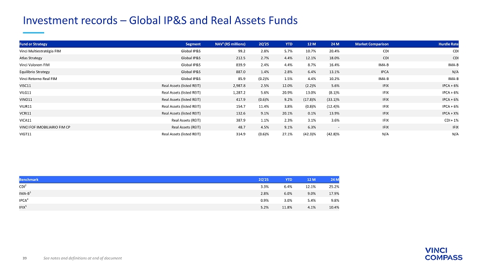 39项投资记录–全球IP & S和实物资产基金见附注和文件末尾的定义门槛率市场比较2400万1200万年初至今2Q'25 NAV丨(百万雷亚尔)分部基金或战略CDI CDI 20.4% 10.7% 5.7% 2.8% 99.2 Global IP & S Vinci Multiestrat é gia FIM CDI CDI 18.0% 12.1% 4.4% 2.7% 212.5 Global IP & S Atlas Strategy IMA-B IMA-B 16.4% 8.7% 4.4% 2.4% 839.9 Global IP & S Vinci Valorem FIM N/A IPCA 13.1% 6.4% 2.8% 1.4% 887.0 Global IP & S Equilibrio Strategy IMA-B IMA-B 10.2% 4.4% 1.5%(0.2)% 85.9 Global IP & S Vinci Retorno Real FIM IPCA + 6% IFIX 5.6%(2.2)% 12.0% 2.5% 2,987.8 Real Assets(Listed REIT)VISC11 IPCA + 6% IFIX(8.1)% 13.0% 20.9% 5.6% 1,287.2IFIX(33.1)%(17.8)% 9.2%(0.6)% 417.9 Real Assets(Listed REIT)VINO11 IPCA + 6% IFIX(12.4)%(0.8)% 3.8% 11.4% 154.7 Real Assets(Listed REIT)VIUR11 IPCA + X % IFIX 13.9% 0.1% 20.1% 9.1% 132.6 Real Assets(Listed REIT)VCRI11 CDI + 1% IFIX 3.6% 3.1% 2.3% 1.1% 387.9 Real Assets(REIT)VICA11 IFIX IFIX-6.3% 9.1% 4.5% 48.7 Real Assets(REIT)VINCI FOFIMOBILIARIO FIM CP N/A N/A(42.8)%(42.3)% 27.1%(0.6)% 314.9 Real Assets(Listed RE39.8% 5.4% 3.0% 0.9% IPCA 410.4% 4.1% 11.8% 5.2% IFIX 5
