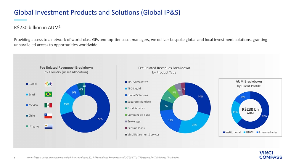 670% 15% 9% 4% 1%与费用相关的收入²按国家(资产配置)细分全球巴西墨西哥智利乌拉圭全球投资产品和解决方案(全球IP & S)提供对世界级GP和顶级资产管理公司网络的访问,我们提供定制的全球和当地投资解决方案,在全球范围内提供无与伦比的机会。2300亿雷亚尔AUM 2300亿雷亚尔AUM 1注:截至2025年6月的管理和咨询资产;²截至2Q'25 YTD的费用相关收入;φ TPD代表第三次定期分配。30% 25% 19% 7% 7% 5% 4% 3%费用相关收入按产品类型细分TPD φ替代TPD Liquid Global Solutions单独授权基金服务混合基金经纪养老金计划Vinci Retirement Services 62% 21% 16% AUM按客户简介机构HNWI中介机构细分