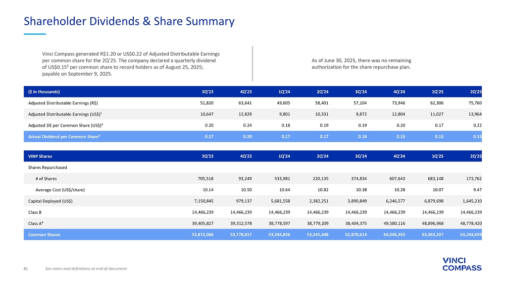 41见附注和文件末尾的定义股东股息和股份摘要2Q‘25 1Q’25 3Q‘24 3Q’24 2Q‘24 1Q’24 3Q‘23 3Q’23(千美元)75,76062,30673,94657,10458,40149,60563,64151,820调整后可分配收益(R $)13,96411,02712,8049,87210,3319,80112,82910,647调整后可分配收益(美元)丨0.22 0.17 0.20 0.190.190.180.24 0.20调整后每股普通股DE(美元)² 0.15 0.15 0.15 0.16 0.17 0.20 0.17每股普通股实际股息丨2Q‘25 1Q’25 1Q‘24 3Q’24 1Q‘24 1Q’24 3Q‘23 3Q’23 VINP股份回购10.82 10.64 10.50 10.14平均成本(美元/股)1,645,2106,879,6986,246,5773,890,8492,382,2515,681,558979,1377,150,845部署资本(美元)14,466,23914,466,23914,466,23914,466,23914,466,23914,466,23914,466,239 B类48,778,42048,896,96849,580,11638,404,37538,779,20938,778,59739,312,57839,405,827 A类63,244,65963,363,20764,046,35552,8该公司宣布向截至2025年8月25日的记录持有人派发每股普通股0.15 ²美元的季度股息;将于2025年9月9日支付。截至2025年6月30日,股份回购计划已无剩余授权。