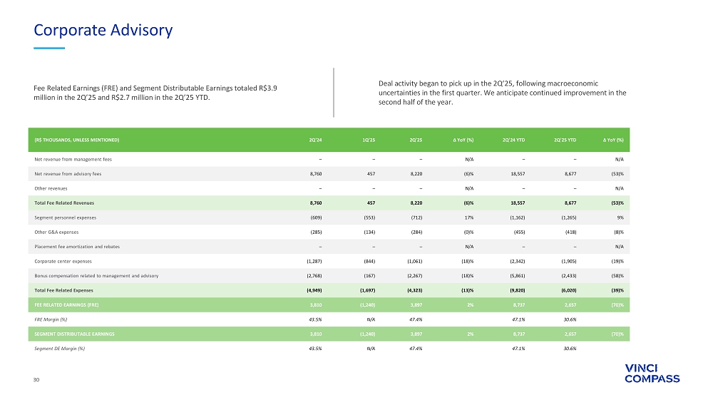 29 Real Assets总AUM为120亿雷亚尔,同比增长14%。120亿雷亚尔的AUM费用相关收益同比增长25%,反映出在VICC最终关闭的追赶费和无机增长推动下的强劲业务势头。Segment DE同比增长25%,这是由于确认了FIP Infra Transmiss ã o基金的业绩费用,这些费用最初记为未实现。这一动态结果对中性的PRE产生影响,因为已实现和未实现的业绩费用相互抵消,但对已实现业绩和GP投资收益的分部DE产生积极影响。↓同比(%)2Q‘25年初至今2Q’24年初至今丨同比(%)2Q‘25 1Q’25 2Q'24(千雷亚尔,除非提及)27% 58,96046,32737% 31,96326,99723,275管理费净收入(6)% 2,3222,471(78)% 4731,8502,197咨询费净收入不适用374–不适用197177 –其他收入26% 61,65648,79828% 32,63329,02425,471费用相关总收入115%(6,040)(2,813)99%(3,054)(2,986)(1,535)分部人员费用162%(5,450)(2,080)162%(2,676)(2,774)(1,023)其他G & A费用7%(413)(384)不适用1,181(1,594)(192)安置费摊销和返利丨29%(13,642)(10,593)33%(7,712)(5,931)(5,810)企业中心费用15%(8,912)(7,764)8%(4,829)(4,083)(4,470)与管理层有关的奖金补偿和咨询46%(34,457)(23,636)31%(17,089)(17,368)(13,031)费用相关费用总额8% 27,19925,16125% 15,54311,65612,440费用相关收益(FRE)44.1% 51.6% 47.6% 40.2% 48.8% FRE利润率(%)(100)% 1315(100)% 1 – 315来自绩效费的净收入129% 8,7133,798129% 8,713 – 3,798已实现绩效费150%(8,711)(3,483)150%(8,711)–(3,483)未实现绩效费(77)%(32)(139)(77)%(32)–(139)基于绩效的薪酬不适用(31)176不适用(31)(-)未实现履约费150%(3,083)(1,233)150%(3,083)–(1,233)(+)未实现业绩报酬(3)% 12,18412,576(2)% 9,6722,5129,870(+)已实现GP投资收益12% 44,98140,16225% 30,81314,16824,735分部可分配收益54.5% 61.6% 60.4% 44.9% 63.2%分部DE利润率(%)13% 12,02610,62513% 12,02611,83910,625管理下的收费盈利资产(百万雷亚尔)1.05% 0.90% 1.13% 0.98% 0.91%平均费率(%)实