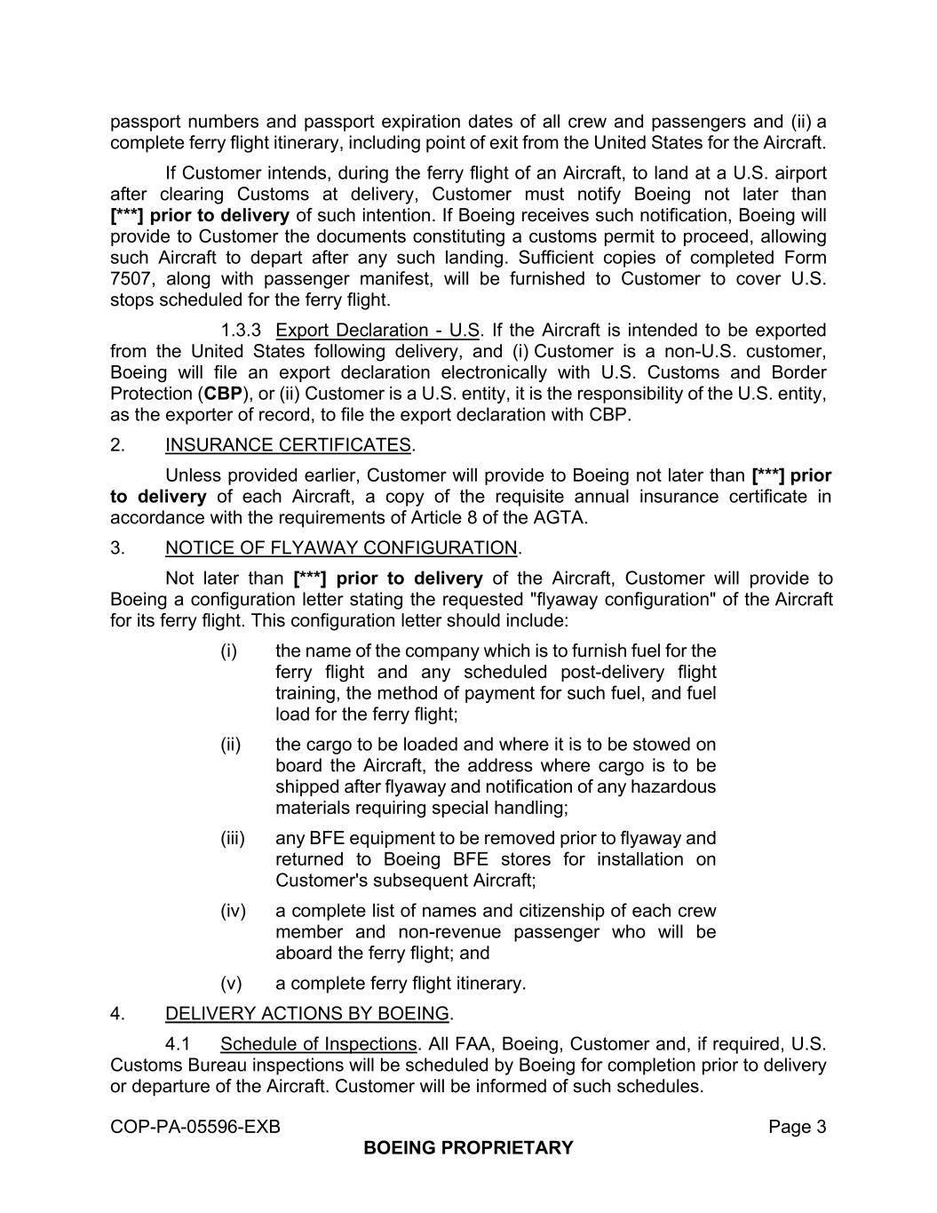 COP-PA-05596-EXB第3页BOEING所有机组人员和乘客的专有护照号码和护照到期日期以及(ii)完整的渡轮飞行行程,包括飞机的美国出境点。如果客户打算在飞机的渡轮飞行期间,在交付时通关后降落在美国机场,客户必须在不迟于交付此种意向之前通知波音公司。如果波音公司收到此类通知,波音公司将向客户提供构成海关许可的文件,以便继续进行,从而允许此类飞机在任何此类降落后离开。将向客户提供足够的填妥的7507表格副本以及乘客舱单,以涵盖渡轮航班预定的美国停靠站。1.3.3出口报关-美国如果飞机打算在交付后从美国出口,并且(i)客户是非美国客户,波音将以电子方式向美国海关和边境保护局(CBP)提交出口申报,或者(ii)客户是美国实体,则美国实体作为记录出口商有责任向CBP提交出口申报。2.保险证书。除非更早提供,否则客户将根据AGTA第8条的要求,不迟于每架飞机交付前向波音公司提供必要的年度保险证书副本。3.FlyAway配置通知。不迟于飞机交付前,客户将向波音公司提供一份配置信函,说明为其渡轮飞行要求的飞机“飞行配置”。这份配置函应包括:(i)将为渡轮航班提供燃料的公司名称和任何预定的交付后飞行培训,此类燃料的付款方式,以及渡轮航班的燃料装载量;(ii)将装载的货物以及将在飞机上存放的位置,货物在飞离后将被装运的地址,并通知任何需要特殊处理的危险材料;(iii)任何BFE设备将在飞离前被移除并返回波音BFE商店安装在客户的后续飞机上;(iv)将登上渡轮航班的每个机组成员和非收入乘客的完整名单和公民身份;以及(v)完整的渡轮飞行行程。4.波音公司的交付行动。4.1检查时间表。美国联邦航空局、波音公司、客户以及如果需要,美国海关局的所有检查都将由波音公司安排在飞机交付或起飞前完成。客户将被告知这样的时间表。