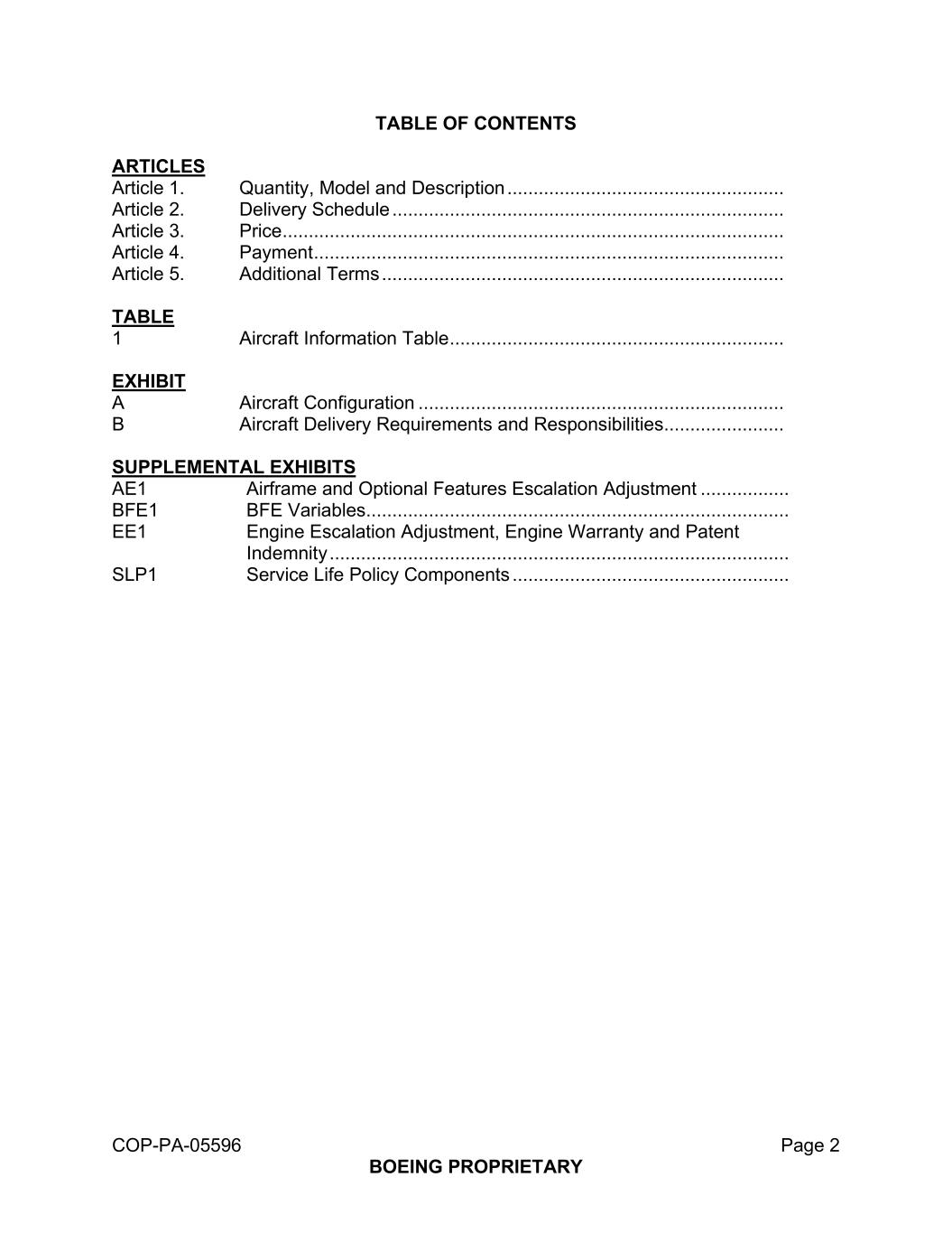 COP-PA-05596第2页BOEING专有目录条款第1条。数量、型号及说明....................................................................。第2条。交付时间表...................................................................................。第3条。价格...................................................................................。第4条。付款...................................................................................。第5条。附加条款...................................................................................。表1飞机信息表...................................................................。展览一架飞机配置...................................................................................。B飞机交付要求和责任......................。补充展览AE1机身和可选特性升级调整.....。BFE1 BFE变量...................................................................................。EE1发动机升级调整、发动机保修和专利赔偿...................................................................................。SLP1使用寿命策略组件....................................................................。