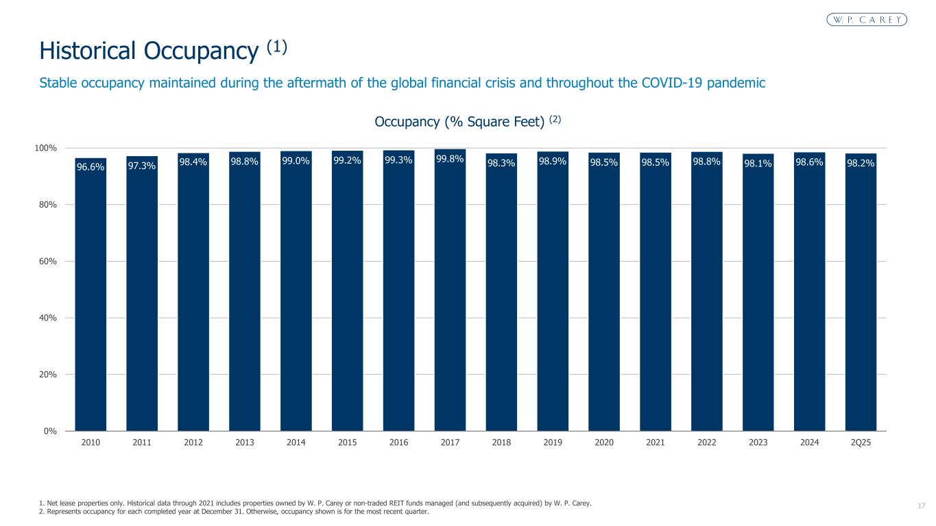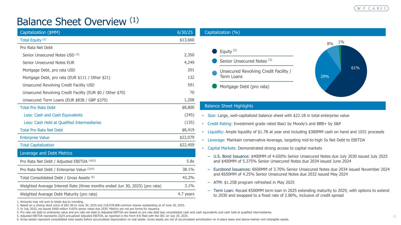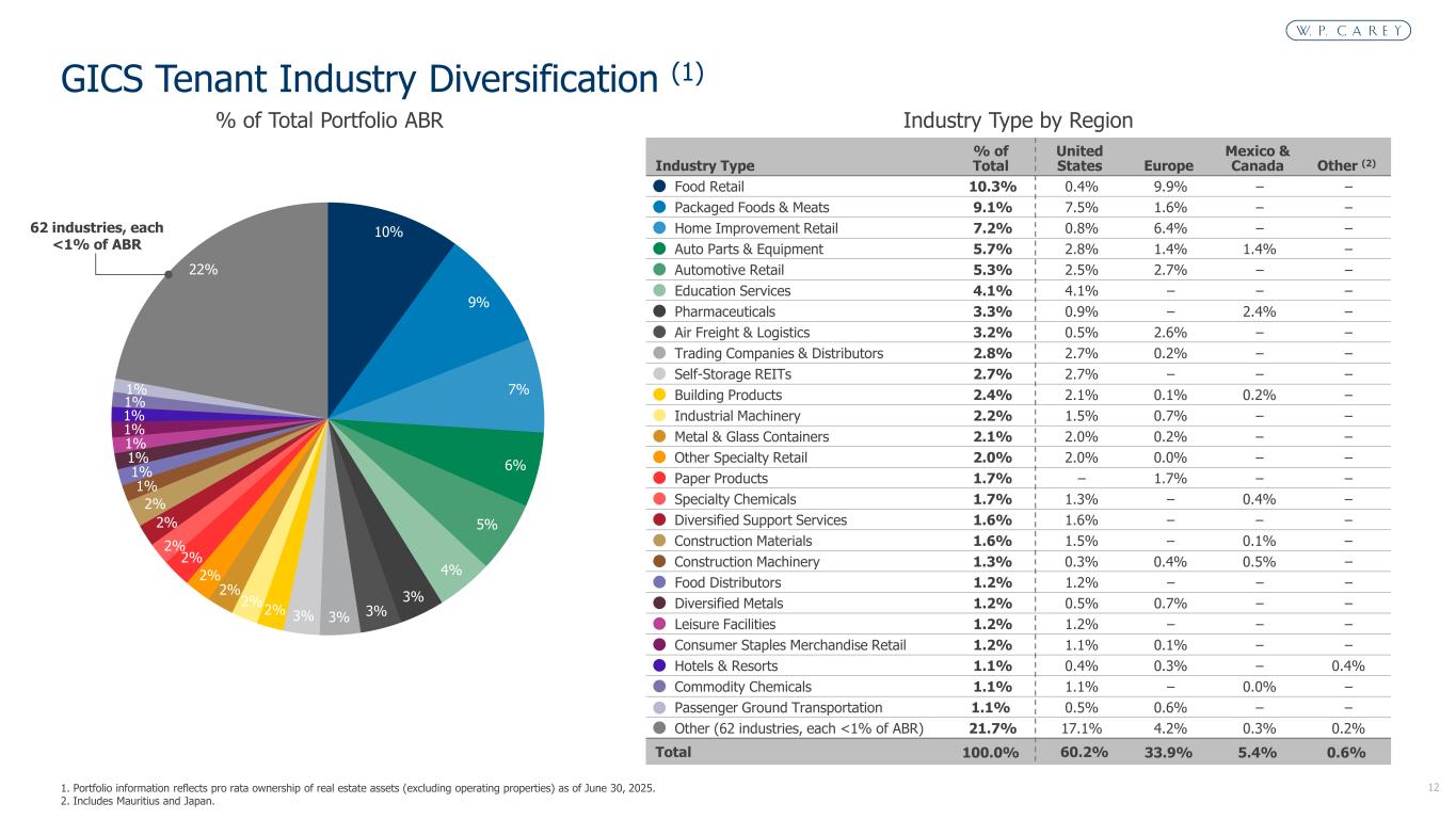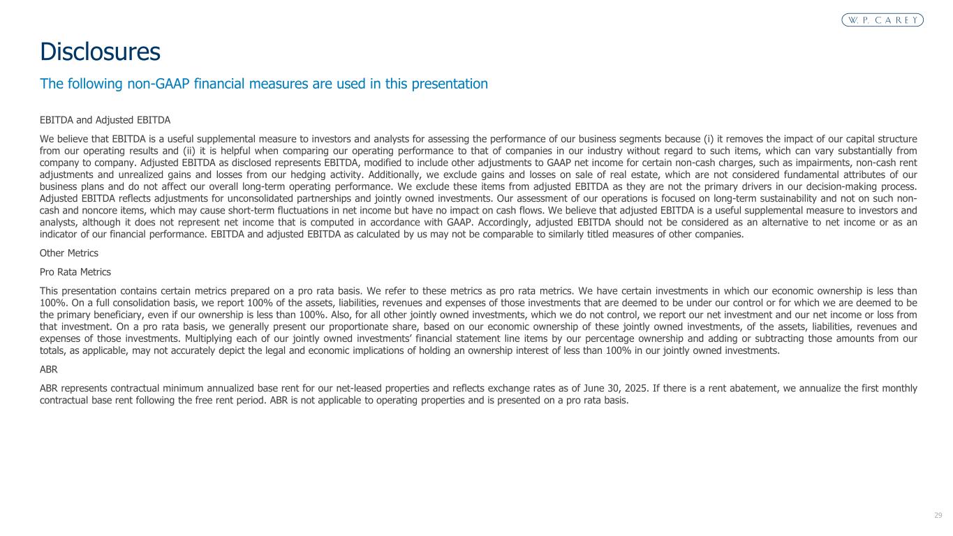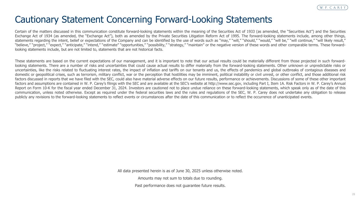28本来文中讨论的某些事项构成经1995年《私人证券诉讼改革法案》修订的1933年《证券法》(经修订,“证券法”)和1934年《证券交易法》(经修订,“交易法”)含义内的前瞻性陈述。前瞻性陈述包括(其中包括)关于公司的意图、信念或期望的陈述,可以通过使用“可能”、“将”、“应该”、“将”、“将会”、“将会继续”、“将可能导致”、“相信”、“项目”、“预期”、“预期”、“打算”、“估计”、“机会”、“可能性”、“战略”、“维持”或这些词语的否定版本以及其他类似术语来识别。这些前瞻性陈述包括但不限于非历史事实的陈述。这些陈述是基于我们管理层当前的预期,重要的是要注意,我们的实际结果可能与此类前瞻性陈述中预测的结果存在重大差异。有许多风险和不确定性可能导致实际结果与前瞻性陈述存在重大差异。其他未知或不可预测的风险或不确定性,例如与波动的利率相关的风险、通货膨胀和关税对我们的租户和我们的影响、流行病和全球传染病爆发的影响以及国内或地缘政治危机,例如恐怖主义、军事冲突、战争或认为敌对行动可能迫在眉睫、政治不稳定或内乱或其他冲突,以及我们向SEC提交的报告中讨论的那些额外风险因素,也可能对我们未来的业绩、业绩或成就产生重大不利影响。对其中一些其他重要因素和假设的讨论包含在W. P. Carey提交给SEC的文件中,并可在SEC网站http://www.sec.gov上查阅,包括第一部分,第1A项。W. P. Carey截至2024年12月31日的财政年度的10-K表格年度报告中的风险因素。请投资者注意,除非另有说明,否则不要过分依赖这些前瞻性陈述,这些陈述仅在本通讯发布之日发表。除联邦证券法和SEC规则和条例要求外,W. P. Carey不承担任何义务公开发布对前瞻性陈述的任何修订以反映本通讯日期之后的事件或情况,或反映意外事件的发生。除非另有说明,本文提供的所有数据均截至2025年6月30日。由于四舍五入的原因,金额总和可能不等于总数。过去的表现并不能保证未来的结果。有关前瞻性陈述的警示性声明