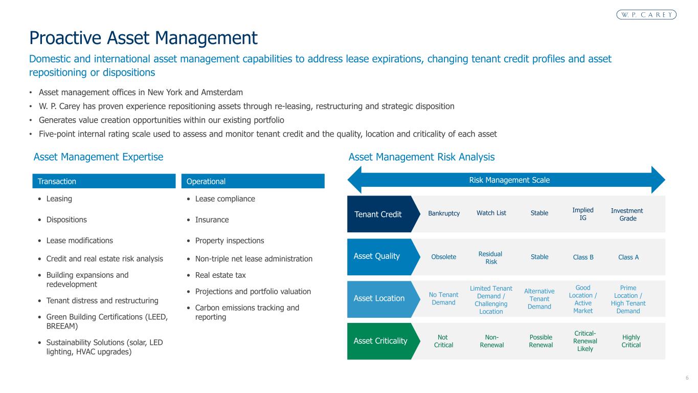 5 •通过投资于净租赁商业地产产生有吸引力的风险调整后回报,主要是在美国以及北欧和西欧•通过将信贷和房地产承销与复杂的结构和直接发起相结合来保护下行空间•收购对租户运营至关重要的“关键任务”资产•通过租金上涨、信贷改善和房地产升值创造上行空间•通过增值扩张、翻新和后续交易利用现有租户关系•我们方法的标志:•按租户、行业、物业类型和地域•纪律严明•机会主义•积极主动的资产管理•保守的资本结构投资策略交易评估基于四个关键因素的租户信誉•行业驱动因素和趋势•竞争对手分析•公司历史•资产的财务资金关键性•关键分销设施或盈利的制造工厂•关键研发或数据中心•表现最佳的零售店基础房地产的基本价值•当地市场分析•物业状况•第三方估值/重置成本•下行分析/再租赁成本交易Structure和定价•租赁条款–租金增长和到期•财务契约•保证金/信用证
