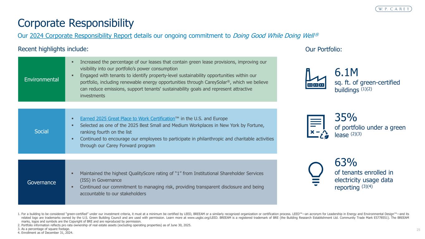25栋6.1m平方英尺的绿色认证建筑(1)(2)绿色租约下35%的投资组合(2)(3)63%的租户注册了用电数据报告(3)(4)我们的2024年企业责任报告详细说明了我们在做好事的同时做好事的持续承诺®企业责任治理社会环境在美国和欧洲获得2025年最佳工作场所认证被《财富》杂志评选为2025年纽约最佳中小型工作场所之一,在榜单上排名第四继续鼓励我们的员工通过我们的Carey Forward计划参与慈善和慈善活动在治理领域保持机构股东服务(ISS)“1”的最高QualityScore评级继续我们对管理风险、提供透明披露和对我们的利益相关者负责的承诺最近的亮点包括:增加我们包含绿色租赁条款的租赁百分比,提高我们对我们投资组合电力消耗的可见性与租户接触,以确定我们投资组合中的物业级可持续发展机会,包括通过CareySolar提供的可再生能源机会®,我们认为这可以减少排放,支持租户的可持续发展目标,并代表有吸引力的投资我们的投资组合:1。根据我们的投资标准,一栋建筑要被视为“绿色认证”,至少必须获得LEED、BREEAM或类似认可的组织或认证流程的认证。LEED —— Leadership in Energy and Environmental Design的首字母缩写词——及其相关标识是美国绿色建筑委员会拥有的商标,经许可使用。欲了解更多信息,请访问www.usgbc.org/LEED。BREEAM是BRE(the Building Research Establishment Ltd. Community Trade Mark E5778551)的注册商标。BREAM标记、标识和符号为BRE版权所有,经许可转载。2.投资组合信息反映截至2025年6月30日按比例拥有的房地产资产(不包括经营性物业)。3.占平方英尺的百分比。4.截至2024年12月31日止注册人数。