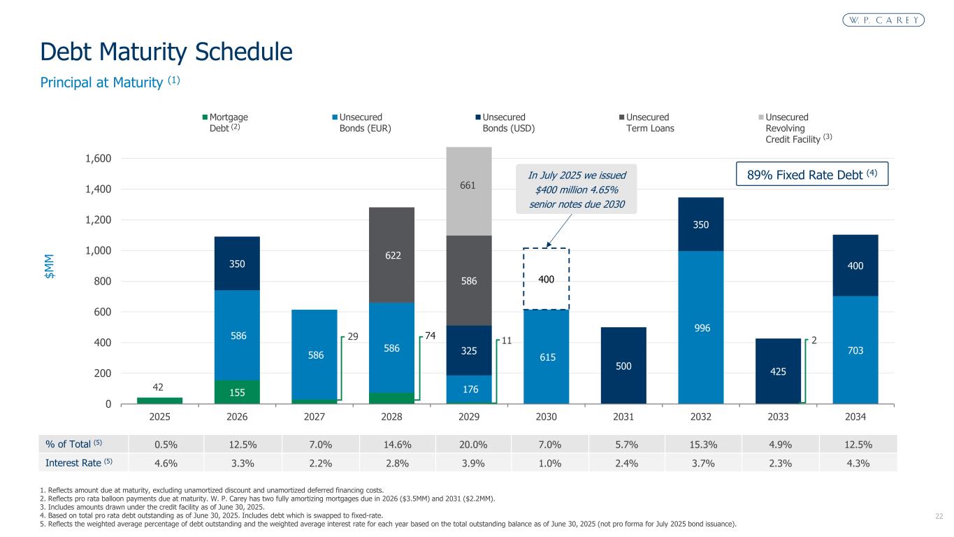 合计22%(5)0.5% 12.5% 7.0% 14.6% 20.0% 7.0% 5.7% 15.3% 4.9% 12.5%利率(5)4.6% 3.3% 2.2% 2.8% 3.9% 1.0% 2.4% 3.7% 2.3% 4.3% $ M M1。反映到期到期的金额,不包括未摊销的贴现和未摊销的递延融资成本。2.反映到期时按比例的气球付款。W. P. Carey有两笔完全摊销的抵押贷款将于2026年(3.5mm美元)和2031年(2.2mm美元)到期。3.包括截至2025年6月30日根据信贷安排提取的金额。4.基于截至2025年6月30日按比例计算的未偿债务总额。包括转换为固定利率的债务。5.反映以截至2025年6月30日的未偿余额总额为基础的各年未偿债务加权平均百分比和加权平均利率(不是2025年7月债券发行的备考)。42155297411258658658658617661599670335032540050035042540062258666102004006008001,0001,2001,4001,6001,8001,80020252026202720282029203020302031203220332034抵押债务无担保债券(欧元)无担保债券(美元)无担保定期贷款无担保循环信贷融资(2)(3)债务到期时间表到期本金(1)89%固定利率债务(4)我们于2025年7月发行了4亿美元、2030年到期的4.65%优先票据