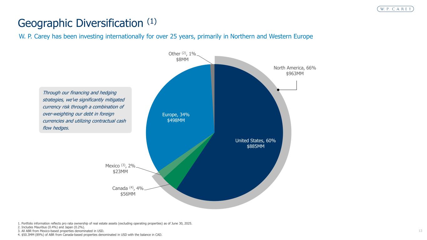 13北美,66% $ 963mm美国,60% $ 885mm加拿大(4),4% $ 56mm墨西哥(3),2% $ 23mm欧洲,34% $ 498mm其他(2),1% $ 8mm1。投资组合信息反映截至2025年6月30日按比例拥有的房地产资产(不包括经营性物业)。2.包括毛里求斯(0.4%)和日本(0.2%)。3.所有ABR均来自以美元计价的墨西哥房产。4.$ 50.3mm(89%)ABR来自加拿大物业以美元计价,余额以加元计价。W. P. Carey已有超过25年的国际投资历史,主要投资于北欧和西欧地理多元化(1)通过我们的融资和对冲策略,我们通过外币债务加权过高和利用合同现金流对冲相结合,显着降低了货币风险。