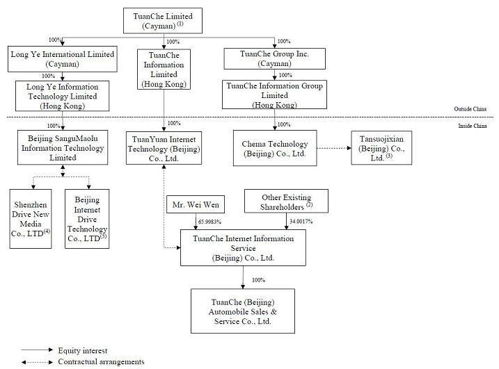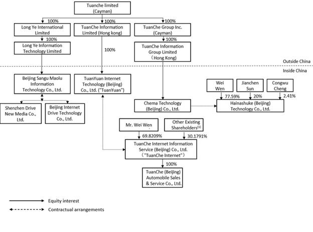 我们不是中国的运营公司。团车有限公司,我们最终的开曼群岛控股公司,没有任何实质性的操作。我们通过我们的子公司以及可变利益实体(“VIE”)及其在中国大陆的子公司在中国大陆开展增值电信业务。我们和我们自己的投资者都没有对VIE的股权所有权、直接对外投资或通过这种所有权或投资控制VIE。相反,我们通过我们在中国大陆的全资子公司(“WFOEs”),与VIE及其各自的股东订立了一系列合同安排。我们和我们的子公司都不拥有VIE的任何份额。由于这些合同安排,出于会计目的,我们是VIE的主要受益者,只有当我们满足美国公认会计原则下的合并条件时,我们才能将VIE的财务业绩与我们的合并。中国法律法规对外商投资增值电信服务业务进行限制和附加条件。因此,我们通过VIE及其子公司在中国大陆经营我们的增值通信业务,我们可以获得经济权利并对VIE的业务运营施加重大影响,从而通过合同安排将VIE的运营和财务业绩合并到我们的财务报表中,前提是我们满足美国公认会计原则下的合并条件。VIE结构用于复制中国法律限制外商直接投资运营公司的外资对中国公司的投资。然而,我们与VIE的合同安排并不等同于对VIE的投资。VIE结构涉及ADS投资者的独特风险。ADS的投资者购买的是我们最终的开曼群岛控股公司的股本证券,而不是购买VIE的股本证券,ADS的投资者可能永远不会持有VIE的股本权益。本招股章程补充文件中使用的“我们”、“我们”、“我们的公司”、“我们的”或“团车”指团车有限公司及其附属公司,VIE指团车互联网信息服务(北京)有限公司(“团车互联网”)、深圳驱动新媒体有限公司(“驱动新媒体”)、北京互联网驱动技术有限公司、和/或海纳舒克(北京)科技有限公司(原名:探所集显科技(北京)有限公司)及其各自的附属公司,视文意而定。
