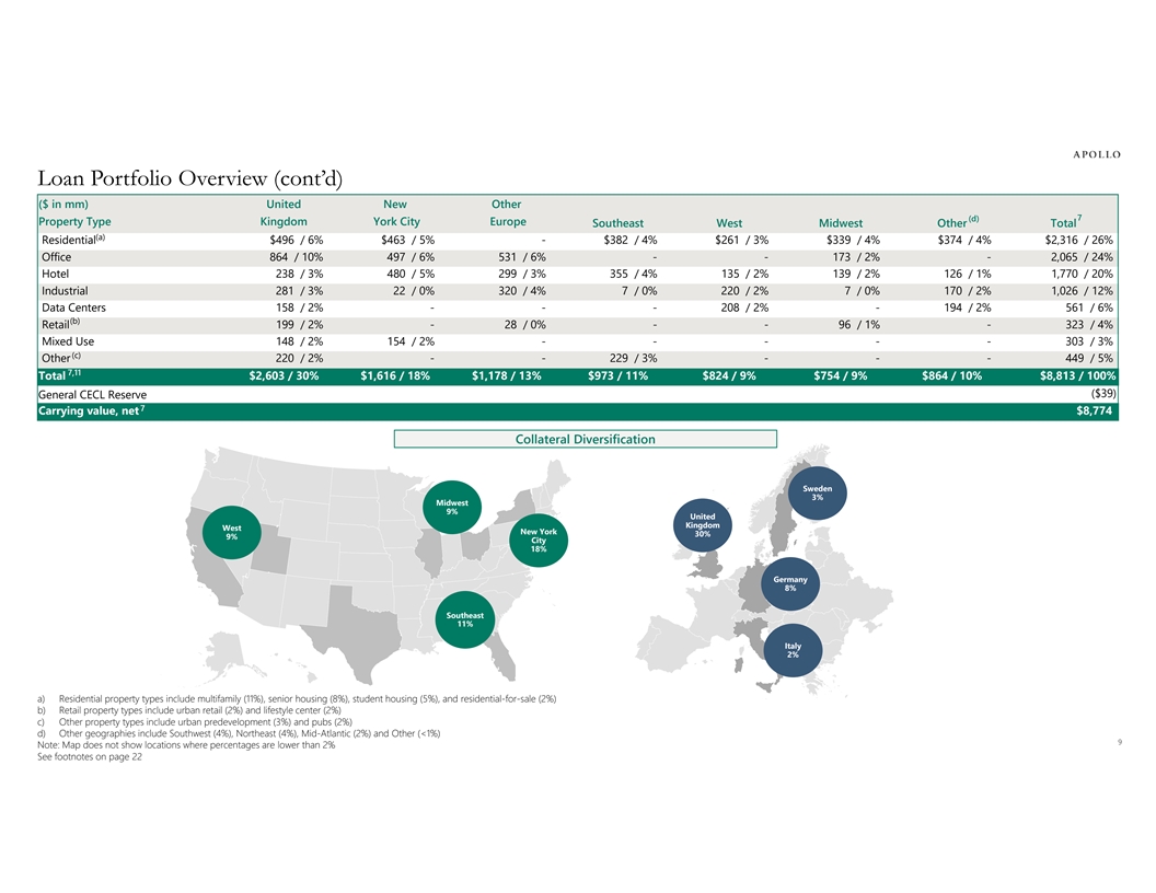 贷款组合概览(续)($ in mm)United New Other 7(d)Property Type Kingdom York City Europe Southeast West Midwest Other Total(a)Residential $ 496/6% $ 463/5%-$ 382/4% $ 261/3% $ 339/4% $ 374/4% $ 2,316/26% Office 864/10% 497/6% 531/6%--173/2%-2,065/24% Hotel 238/3% 480/5% 299/3% 355/4% 135/2% 139/2% 126/1% 1,770/20% Industrial 281/3% 22/0% 320/4% 7/0% 220/2% 7/0% 170/2% 1,026/12%数据中心158/2%---208/2%-194/2% 561/6%(b)零售199/2%-28/0%--96/1%-323/4%混合用途148/2% 154/2%----303/3%(c)其他220/2%--229/3%---449/5% 7,11合计$ 2,603/30% $ 1,616/18% $ 1,178/13% $ 973/11% $ 824/9% $ 754/9% $ 864/10% $ 8,813/100%($ 39)General CECL Reserve 7账面价值,净额$ 8,774抵押品多元化瑞典3%中西部9%英国西纽约30% 9%城市18%德国8%东南11%意大利2% Bing Powered©GeoNames、微软、TomTom Powered by Bing a)住宅物业类型包括多户住宅(11%)、老年住宅(8%)、学生住宅(5%)、住宅待售(2%)©GeoNames,Microsoft,Open Places,OpenStreetMap,TomTom b)零售物业类型包括城市零售(2%)和生活方式中心(2%)c)其他物业类型包括城市前期开发(3%)和酒吧(2%)d)其他地区包括西南(4%)、东北(4%)、中大西洋(2%)和其他(< 1%)9注:地图未显示百分比低于2%的位置见第22页脚注