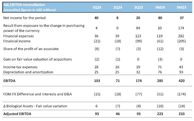 在这份新闻稿中,EBITDA,一种非国际财务报告准则的财务指标,被定义为该期间的净收入,加上财务费用,减去财务收入,减去应占联营公司的利润(亏损),加上(减去)净货币头寸的损失(收益),加上所得税费用,加上折旧和摊销,减去终止经营的净业绩。