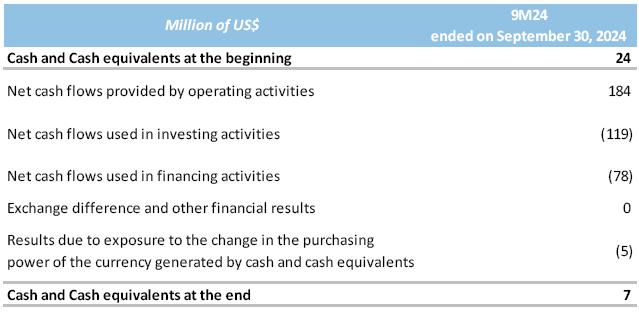 现金及现金等价物净减少1200万美元。汇兑差额和其他财务业绩为0.5百万美元,而货币购买力变化导致的现金和现金等价物的货币损失为4百万美元。因此,鉴于截至2024年1月1日的现金和现金等价物为2400万美元,截至2024年9月30日,最终为700万美元。