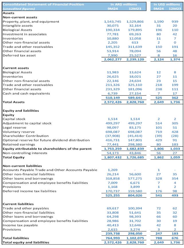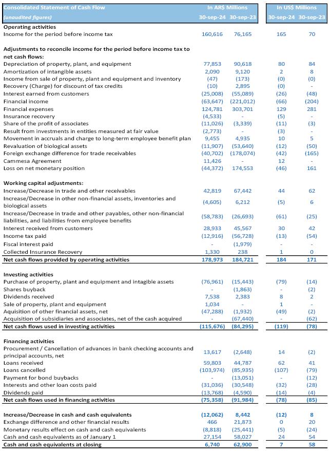 将阿根廷比索兑换成美元所使用的外汇汇率是央行(通信“A”3500)截至2024年9月30日(970.92阿尔美元兑1.00美元)、2024年6月30日(911.75阿尔美元兑1.00美元)、2024年3月31日(857.42阿尔美元兑1.00美元)和2023年9月30日(350.01阿尔美元兑1.00美元)酌情报告的参考汇率。