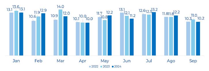 最后,为了应对更高的能源需求,增加了热力发电量。尽管可用性略有下降(2024年第三季度平均为71%,2023年同期平均为73%),但发电量同比增长13%。热力发电量增长导致燃料消耗增加:66%的瓦斯油、9%的天然气和3%的燃料油。对可用性水平的细分显示,联合循环数据增加了4%,从90%增加到94%,而燃气和蒸汽轮机减少了4%,从61%减少到57%。