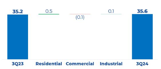 发电&需求:与23年第三季度录得的35,195吉瓦时相比,24年第三季度的能源需求增长1%至35,635吉瓦时,这基本上是由于天气条件导致的居民消费上升所致。今年7月和8月与2023年同月相比气温较低促使零售消费增加,由于与2023年同月相比气温较温和,9月零售消费有所萎缩。首尾相连,居民消费升3%。主要需求方面,录得略高的消费,特别是批发主要需求,受更强劲的经济活动提振。趋势类似于住宅模式:7月和8月期间的同比正增长率,然后在9月下降。