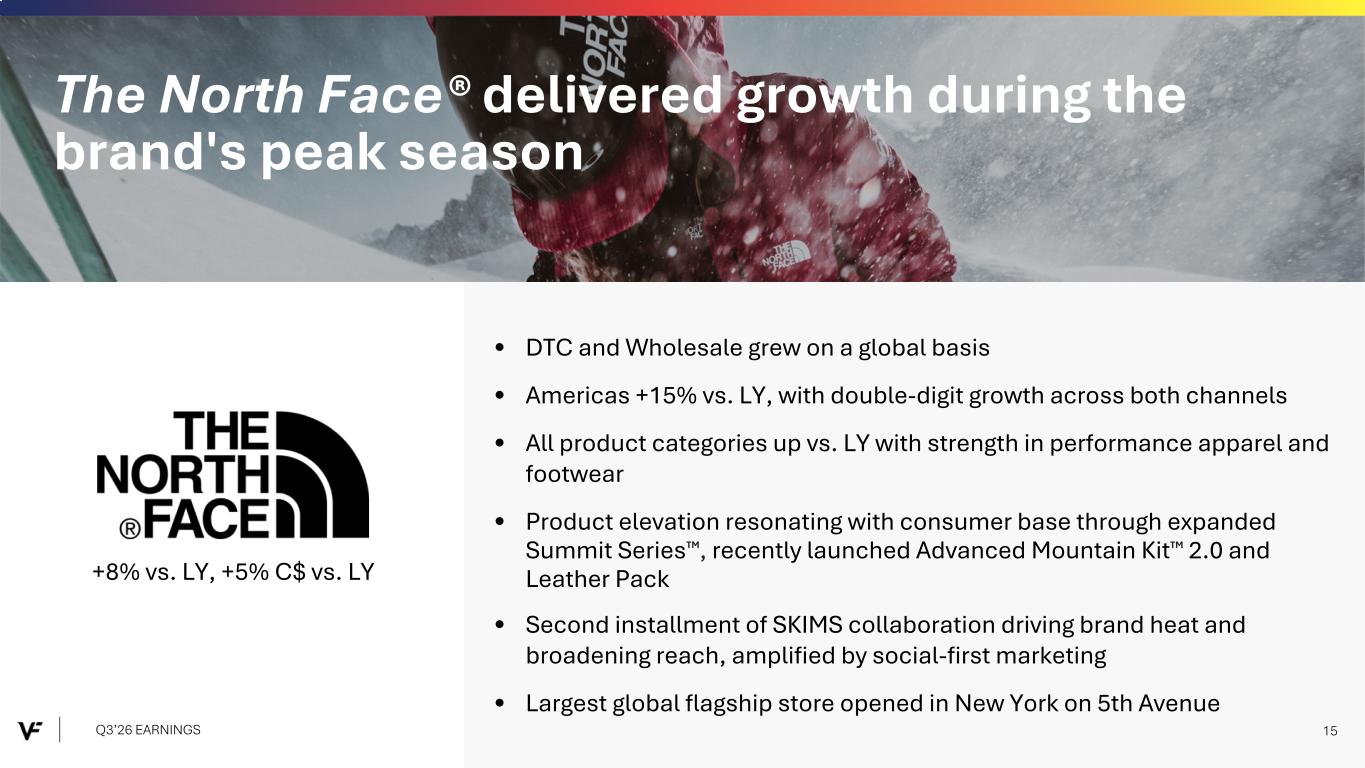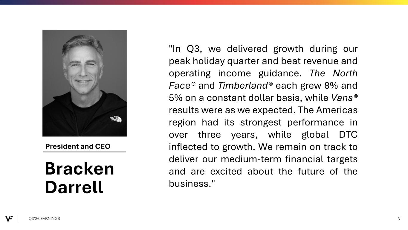 总裁兼首席执行官“在第三季度,我们在假期高峰季度实现了增长,并超过了收入和营业收入指引。北面®和Timberland®按固定美元计算,每辆车分别增长8%和5%,而Vans®结果如我们所料。美洲地区创下三年多来的最强劲表现,而全球DTC则转为增长。我们仍有望实现中期财务目标,并对业务的未来感到兴奋。”Q3’26盈余6 Bracken Darrell