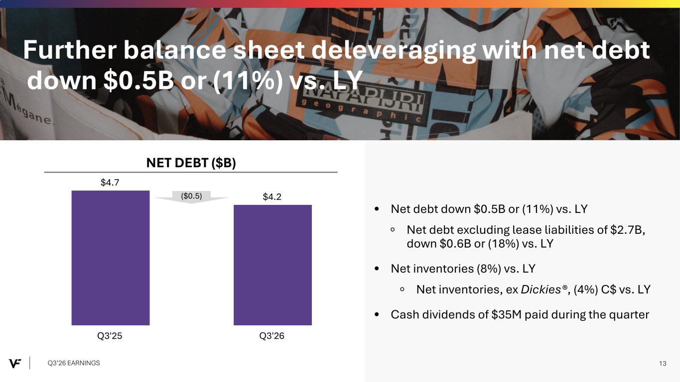 •净债务下降$ 0.5B或(11%)vs. LY ↓不包括租赁负债的净债务为$ 2.7B,下降$ 0.6B或(18%)vs. LY •净库存(8%)vs. LY丨净库存,ex Dickies®,(4%)C $ vs. LY •本季度支付的现金股息为3500万美元净债务($ B)$ 4.7 $ 4.2 Q3‘25 Q3’26 Q3 ' 26收益13($ 0.5)进一步资产负债表去杠杆化,净债务较LY下降$ 0.5B或(11%)