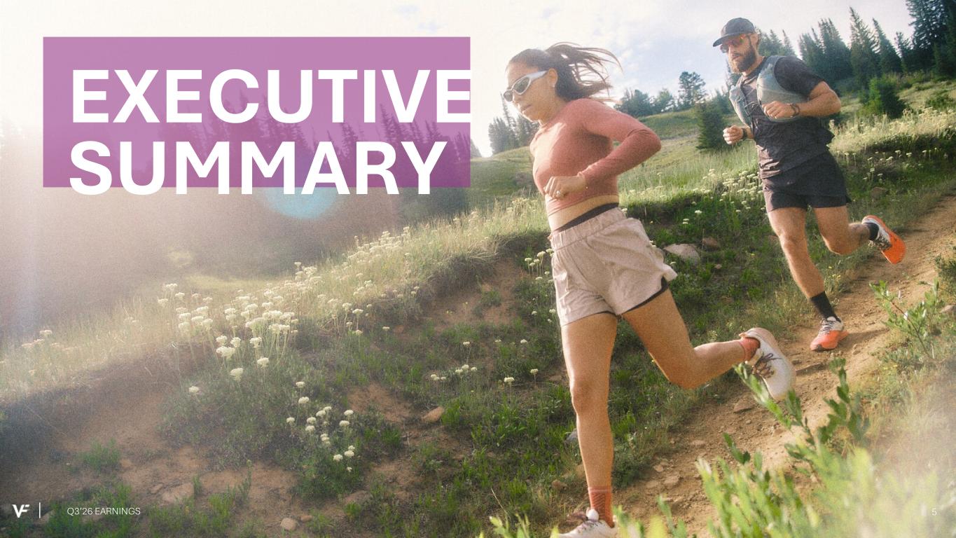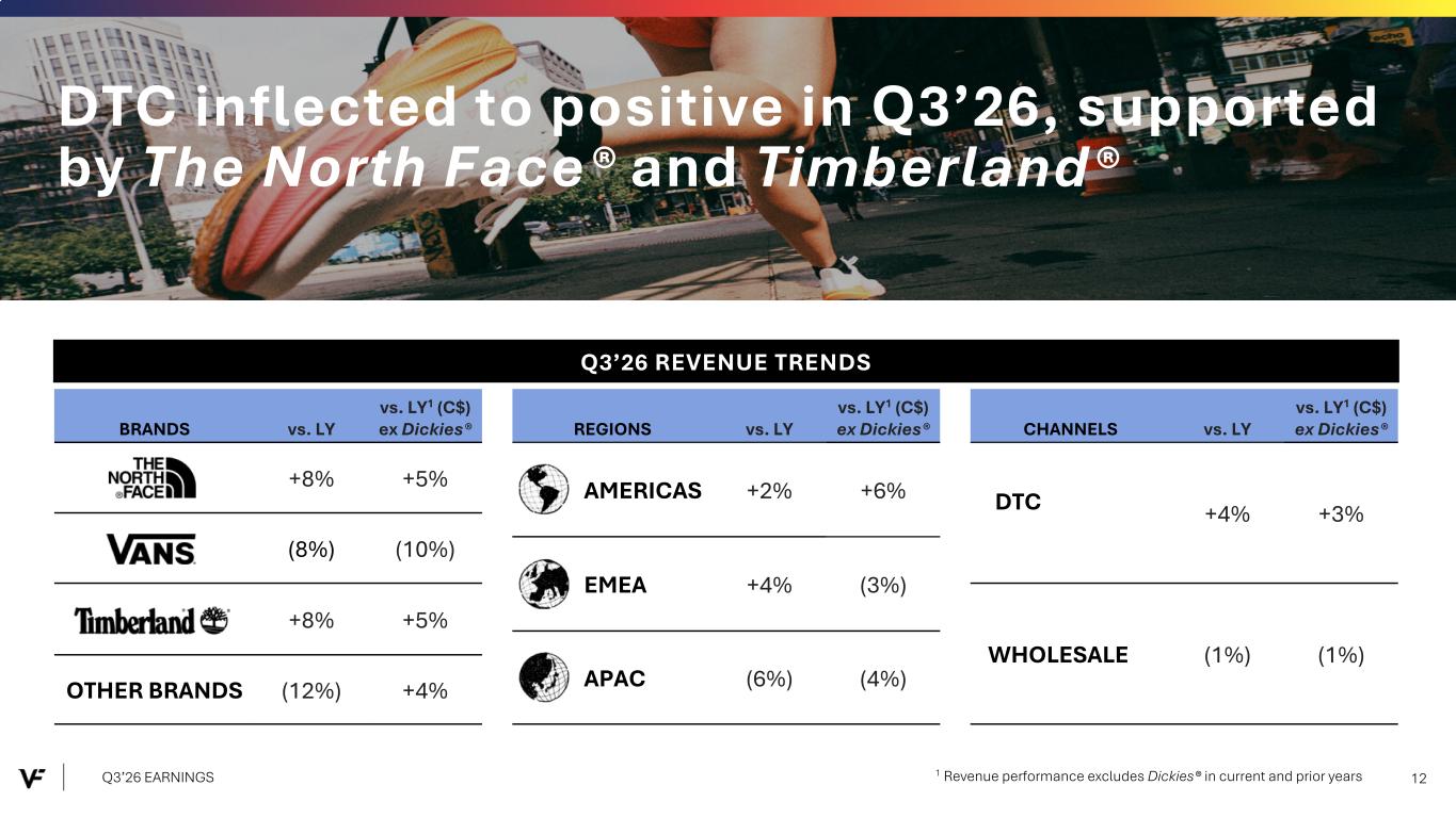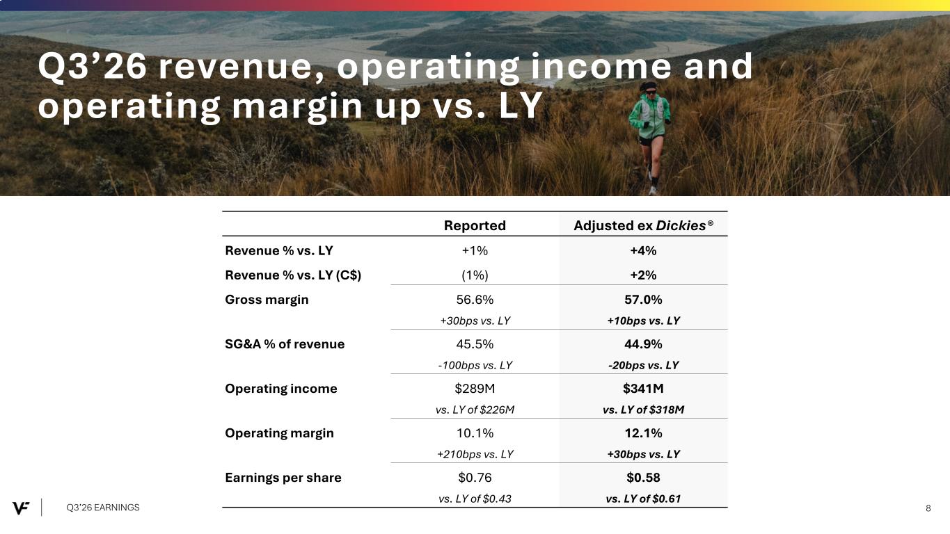财务列报披露所有每股金额均在稀释基础上列报。本演示文稿提及“报告”(R $)和“固定美元”(C $)或“固定货币”金额,这些术语在下面的标题“固定货币-不包括外币的影响”下描述。除非另有说明,“报告”和“不变美元”或“不变货币”的金额相同,除非另有说明,金额将作为“报告”。该演示文稿还提到“持续”和“终止”运营金额,这是在“终止运营-Supreme”标题下描述的概念。除非另有说明,所列结果均以持续经营为基础。该演示文稿还提到了“不包括Dickies”的结果®”和“调整后不包括Dickies”,在“Dickies Divestiture”标题下进行了描述。这份报告还提到了“调整后”的金额,这一术语在“调整后的金额-不包括重塑、交易和交易相关活动、养老金结算费用和非现金减值费用”标题下进行了描述。除非另有说明,“报告”和“调整后”的金额是相同的。VF使用52/53周的财政年度进行运营和报告,该财政年度在最接近每年3月31日的星期六结束。该演示文稿将VF的2026财年第三季度称为Q3‘26,同样Q3’25表示VF的2025财年第三季度等。VF将“自由现金流”定义为来自持续经营业务的现金流减去资本支出和软件购买,并将“净债务”定义为长期债务、长期债务的流动部分、短期借款和经营租赁负债,减去VF合并资产负债表中的现金和现金等价物。可报告分部的变化VF在2026财年第一季度重新调整了其可报告分部。VF更新的可报告分部为Outdoor和Active。我们将未达到量化阈值的剩余经营分部列入“所有其他”类别,作为单独的可报告分部进行披露。本演示文稿中的VF财务业绩反映了所有演示文稿期间的新分部。Dickies剥离2025年9月15日,VF与Bluestar Alliance LLC达成最终协议,出售Dickies®品牌业务(“Dickies”)和2025年11月12日,VF完成出售Dickies。“报告”金额根据美国公认会计原则(“GAAP”)呈现VF 2026财年第三季度业绩,并将Dickies业绩包括在截至销售日期的持续经营业务中,因为Dickies销售不符合GAAP下的已终止经营业务列报条件。参考结果“不包括Dickies®”和“调整后不包括Dickies”不包括所有呈报期间的Dickies结果。VF认为,在出售Dickies交易结束后,这份非GAAP演示文稿为投资者提供了有关VF当前业务趋势和VF运营表现的有用信息。终止运营-Supreme于2024年7月16日,VF与EssilorLuxottica S.A.签订了最终的股票和资产购买协议,以出售Supreme®品牌业务(“Supreme”)。2024年10月1日,VF完成了Supreme的销售。据此,公司已将相关的持有待售资产和负债报告为已终止经营业务的资产和负债,并将截至出售日期的所有呈报期间的经营成果和业务现金流量计入已终止经营业务。不变货币-不包括外币的影响本演示文稿指的是根据公认会计原则“报告”的金额,其中包括外币汇率的换算和交易影响。这份报告还提到了“不变美元”和“不变货币”的金额,其中不包括将外币换算成美元的影响。GAAP措施与固定货币金额的对账在本演示文稿包含的补充财务信息中列出,该信息确定并量化了所有排除的项目,并提供了管理层对这些信息为何对投资者有用的看法。Q3’26收益2