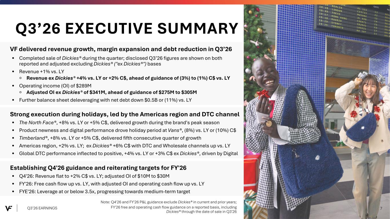 VF在Q3’26实现了收入增长、利润率扩张和债务减少•完成了Dickies的销售®本季度期间;已披露的Q3’26数据显示在报告和调整后的两个数据上,不包括Dickies®(" ex Dickies®")bases • revenue + 1% vs. LY ⑤ revenue ex dickies®+ 4% vs. LY或+ 2% C $,高于(3%)至(1%)C $ vs. LY的指引•营业收入(OI)为2.89亿美元⑤调整后的OI ex Dickies®3.41亿美元,在2.75亿美元至3.05亿美元的指引之前•进一步资产负债表去杠杆化,净债务下降0.5B美元或(11%)vs. LY建立Q4‘26指引并重申26财年目标• Q4’26:收入与LY持平至+ 2%加元;调整后OI为1000万美元至3000万美元• FY‘26:自由现金流与LY相比上升,调整后的OI和经营现金流与LY相比上升• FYE’26:杠杆率处于或低于3.5倍,向中期目标推进假期期间的强劲执行,以美洲地区和DTC渠道为首• The North Face®,+ 8% vs. LY或+ 5% C $,品牌旺季实现增长•产品新颖性和数字化表现推动了Vans的假期®,(8%)vs. LY或(10%)C $ • Timberland®,+ 8% vs. LY或+ 5% C $,实现连续第五个季度增长•美洲地区,+ 2% vs. LY;ex Dickies®+ 6%加元,DTC和批发渠道上涨vs. LY •全球DTC业绩转为正值,+ 4% vs. LY或+ 3% C $ ex Dickies®,受数字驱动Q3‘26收益7 Q3’26执行摘要注:Q4‘26和FY’26损益指引不包括Dickies®本年度和以往年度;报告基础上的FY'26自由和经营现金流指导,包括Dickies®截至26年Q3销售日期