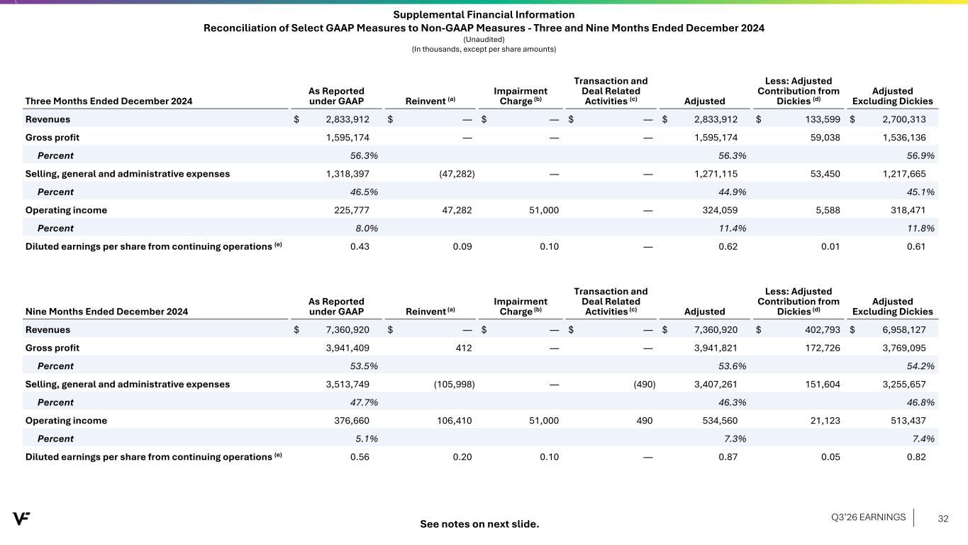 补充财务信息选定GAAP措施与非GAAP措施的对账-截至2025年12月的三个月和九个月(未经审计)(以千为单位,每股金额除外)注:(a)与VF转型计划Reinvent相关的成本,包括重组费用和项目相关成本,在截至2025年12月的三个月和九个月分别为510万美元和5140万美元。这些成本主要涉及与聘用咨询公司支持VF转型之旅相关的遣散费和与员工相关的福利和费用。VF在2025财年第二季度与一家咨询公司签订了合同,合同项下的服务在2026财年第三季度基本完成。除了支付服务费用外,该合同还包括与截至2027年6月VF股价上涨相关的或有费用。截至2025年12月的三个月和九个月,与合同相关的费用,包括或有费用,分别为810万美元和2530万美元。Reinvent在截至2025年12月的三个月和九个月中分别产生了160万美元和1190万美元的净税收优惠。该公司与Reinvent相关的重组费用总额为2.077亿美元。基本上所有重组行动都在2026财年第一季度末完成。与这家咨询公司的合同相关的总费用可能高达1.460亿美元,其中7500万美元的费用取决于截至2027年6月VF股价的上涨。(b)VF在截至2025年12月的三个月和九个月内确认了与Napapijri报告单位商誉相关的非现金减值费用3070万美元。截至2025年12月底的三个月和九个月的其他收入(费用)净额项目中记录了34.0百万美元的非现金养老金结算费用。养老金结算费用是由于美国合格计划的终止而一次性支付的退休福利,预计将在2026财年末完成。减值和养老金结算费用在截至2025年12月的三个月和九个月中产生了940万美元的净税收优惠。(c)交易和交易相关活动包括与剥离Dickies相关的成本,截至2025年12月的三个月和九个月,总计分别为820万美元和1020万美元。此外,这些活动还包括与剥离Dickies相关的估计税前销售收益,总额为1.391亿美元,记录在截至2025年12月的三个月和九个月的合并运营报表的其他收入(费用)、净额项目中。交易和交易相关活动在截至2025年12月的三个月和九个月中分别产生了540万美元和590万美元的净税收优惠。(d)“Dickies的调整后贡献”一栏为Dickies截至2025年12月底止三个月和九个月经调整后的经营业绩。本栏不包括上述交易和交易相关费用。来自Dickies的调整后贡献导致截至2025年12月的三个月和九个月的净税收优惠分别为260万美元和净税收支出为330万美元。(e)表中所列数额是使用未四舍五入的数字计算的。每股摊薄收益(亏损)影响分别使用截至2025年12月底止三个月和九个月的397,157,000股和394,414,000股加权平均普通股计算。非GAAP财务信息上述财务信息是在GAAP基础上,在调整后的基础上呈现的,其中不包括Reinvent、减值和养老金结算费用以及交易和交易相关活动的影响,在调整后的基础上不包括Dickies,这也不包括Dickies在调整后的基础上的经营业绩。这些调整后的表述提供了非公认会计原则的衡量标准,并不基于任何一套全面的会计规则或原则。管理层认为,这些措施为投资者提供了有关VF基本业务趋势和VF持续运营业绩的有用补充信息,并有助于此类运营的期间对比。管理层在其预算编制和审查过程中内部使用上述财务措施,在某些情况下,将其作为确定薪酬的一个因素。虽然管理层认为这些非GAAP财务指标对评估业务很有用,但这些信息应被视为补充性质,应被视为是对VF根据GAAP计算的经营业绩指标的补充,而不是代替或优于这些指标。此外, 这些非GAAP财务指标可能与其他公司提出的类似标题的指标不同。这些衡量标准应仅与相应的GAAP衡量标准一起用于评估公司的经营业绩。Q3’26收益31