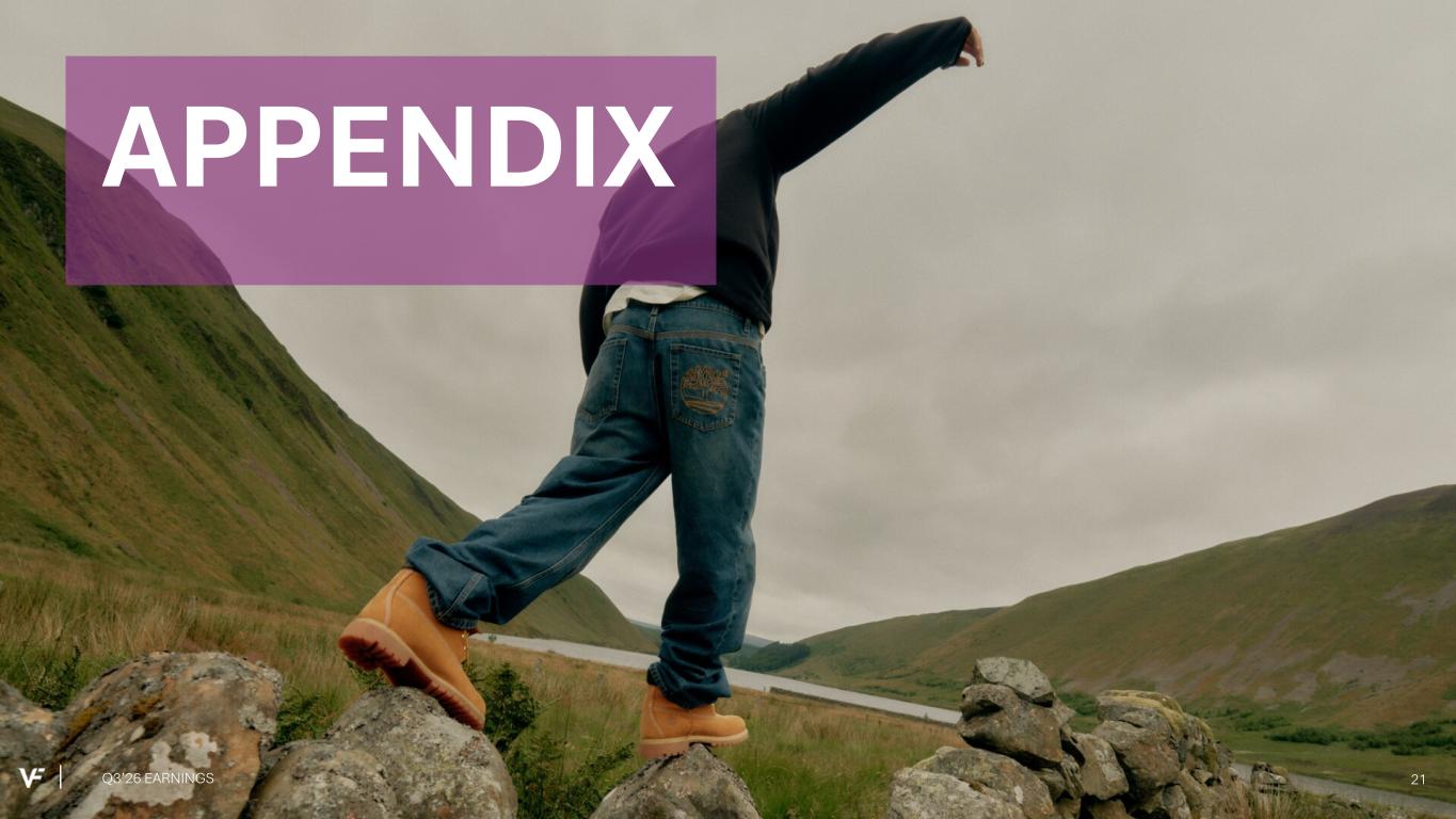 安全港声明本新闻稿中包含的某些声明属于1995年《私人证券诉讼改革法案》安全港条款含义内的“前瞻性声明”。前瞻性陈述是基于VF对影响VF的未来事件的预期和信念做出的,因此涉及若干风险和不确定性。“将”、“预期”、“相信”、“估计”、“预期”、“应该”、“可能”等具有类似含义或使用未来日期的词语和术语可用于识别前瞻性陈述,但是,没有这些词语或类似表达并不意味着一项陈述不具有前瞻性。所有关于VF与VF运营或财务业绩相关的计划、目标、预测和预期以及与之相关的假设的陈述均为前瞻性陈述。前瞻性陈述并非保证,实际结果可能与前瞻性陈述中明示或暗示的结果存在重大差异。VF不承担公开更新或修改任何前瞻性陈述的义务,无论是由于新信息、未来事件或其他原因,除非法律要求。可能导致VF的实际运营结果或财务状况与前瞻性陈述明示或暗示的结果存在重大差异的潜在风险和不确定性包括但不限于:消费者对服装、鞋类和配饰的需求水平;VF分销系统的中断;全球经济状况的变化以及VF消费者和客户的财务实力,包括由于当前的通胀压力;原材料和成品的价格、可用性和质量的波动,包括由于关税;全球资本和信贷市场的混乱和波动;VF对不断变化的时尚趋势、不断演变的消费者偏好和不断变化的消费者行为模式的反应;VF维护其品牌形象、健康和公平的能力,包括通过投资于品牌建设和产品创新;来自在线零售商的激烈竞争和其他直接面向消费者的业务风险;利润率压力增加;零售行业的变化和挑战;VF执行其Reinvent转型计划、“VF方式”和其他业务优先事项的能力,包括采取措施精简和调整其成本基础规模,并在降低杠杆率的同时加强资产负债表;VF成功建立全球商业组织的能力,并识别和捕捉其商业模式的效率;VF或其所依赖的第三方无法维持信息技术系统的强度和安全性;VF的设施和系统以及其所依赖的第三方的设施和系统是严重程度不同的网络攻击的频繁目标,未来可能容易受到此类攻击,以及VF或此类第三方无法或未能预测或检测到数据或信息安全漏洞或其他网络攻击,可能导致数据或财务损失、声誉损害、业务中断、VF与客户、消费者、员工和其所依赖的第三方之间的关系受损、诉讼、监管调查、执法行动或其他负面影响;VF或其所依赖的第三方无法正确收集、使用、管理和保护业务、消费者和员工数据并遵守隐私和安全法规;VF采用新技术的能力,包括人工智能,以竞争和负责任的方式;外汇波动;VF的供应商制造设施的稳定性以及VF建立和维持有效供应链能力的能力;VF的供应商继续使用道德商业惯例;VF准确预测产品需求的能力;维权人士和其他股东的行动;VF的招聘能力,培养或留住关键的高管或员工人才或成功过渡高管;VF管理层成员的连续性;劳动力可用性和成本的变化;VF保护商标和其他知识产权的能力;可能的商誉和其他资产减值;VF的被许可方和分销商维持VF品牌的价值;VF执行收购和处置、整合收购和管理其品牌组合的能力,包括最近完成的出售Dickies®品牌业务;VF的执行能力,并实现效益,成功,或根本,从完成出售Dickies®品牌业务;应对自然或人为的经济、公共卫生、网络、政治或环境破坏的业务弹性, 包括关税和国际贸易政策变化的任何潜在影响,以及美国联邦政府停摆;税法和额外税收责任的变化;法律、监管、政治、经济和地缘政治风险,包括与当前欧洲、中东和亚洲冲突以及美中紧张局势相关的风险;法律法规的变化;不利或意外的天气条件,包括气候变化的任何潜在影响;VF的债务及其在必要时以优惠条件获得融资的能力,可能会阻止VF履行其财务义务;VF未来支付和宣布股息或回购其股票的能力;气候变化以及对环境、社会和治理问题的更多关注;VF执行其可持续发展战略并实现其与可持续发展相关的目标和指标的能力;疾病或任何其他传染病的广泛爆发所产生的风险,或任何其他公共卫生危机;以及与2019年完成的牛仔裤业务分拆相关的税务风险。关于可能影响VF财务业绩的潜在因素的更多信息不时包含在VF向SEC提交的公开报告中,包括VF的10-K表格年度报告、10-Q表格季度报告,以及向SEC提交或提供的8-K表格。Q3’26收益22