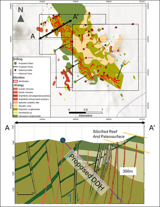 测绘勾勒出了跨越5公里乘6公里区域的三个主要区域,其特征是发育良好的位移断层、硅化亚水平区域以及朱砂的存在,所有这些都表明在深度存在完全保存的超热液系统的潜力。