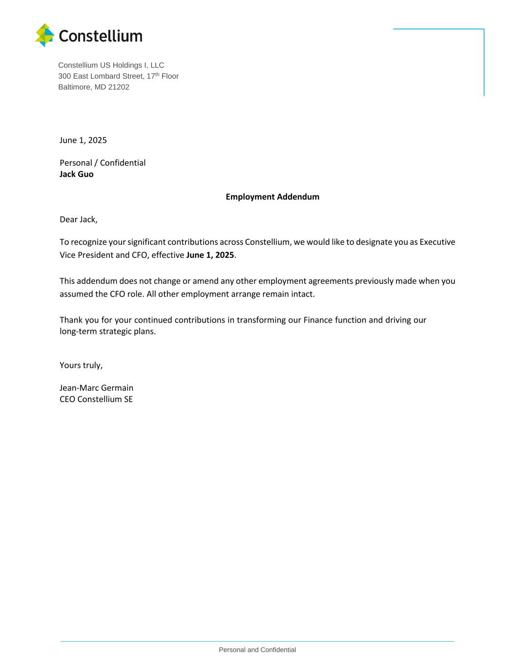 Constellium US Holdings I,LLC 300 East Lombard Street,17th Floor Baltimore,MD 21202个人和机密2025年6月1日个人/机密Jack Guo就业增编尊敬的Jack,为表彰您在Constellium领域的重大贡献,我们谨任命您为执行副总裁兼首席财务官,自2025年6月1日起生效。本增编不会改变或修改之前在您担任CFO职务时签订的任何其他雇佣协议。所有其他就业安排保持不变。感谢您在转变我们的财务职能和推动我们的长期战略规划方面的持续贡献。Yours true,Jean-Marc Germain CEO Constellium SE