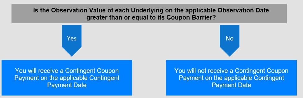 您可能不会收到任何或有息票付款。票据不提供任何定期固定息票支付。票据的投资者不一定会收到票据的任何或有息票付款。如果任何标的在某个观察日的观察值小于其票息障碍,您将不会收到适用于该观察日的或有票息支付。如果在票据期限内的所有观察日,任何标的的观察值均低于其票息壁垒,则在票据期限内,您将不会收到任何或有票息支付,也不会收到票据的正收益。