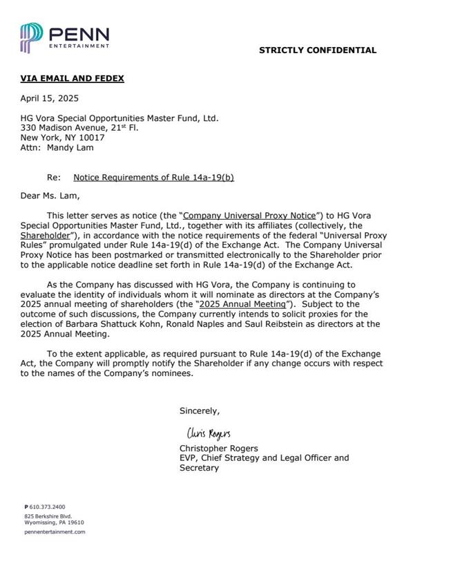 P 610.373.2400825 Berkshire Blvd. Wyomissing,PA 19610 pennentertainment.com通过电子邮件和FEDEX严格保密2025年4月15日HG Vora Special Opportunities Master Fund,Ltd.麦迪逊大道330号,21st FL。New York,NY 10017 Attn:Mandy Lam Re:规则14a-19(b)的通知要求尊敬的Lam女士,根据《交易法》规则14a-19(d)颁布的联邦“通用代理规则”的通知要求,本函作为HG Vora Special Opportunities Master Fund,Ltd.及其关联公司(统称股东”)的通知要求(“公司通用代理通知”)。公司通用代理通知已在《交易法》第14a-19(d)条规定的适用通知截止日期之前以邮戳或电子方式发送给股东。由于公司已与HG Vora进行讨论,公司正在继续评估其将在公司2025年年度股东大会(“2025年年度会议”)上提名为董事的个人的身份。以该等讨论结果为准,公司目前拟征集代理人,以在2025年年度会议上选举Barbara Shattuck Kohn、Ronald Naples和Saul Reibstein为董事。在适用范围内,根据《交易法》第14a-19(d)条的要求,如果公司被提名人的姓名发生任何变化,公司将立即通知股东。此致,Christopher Rogers执行副总裁、首席战略与法务官兼秘书