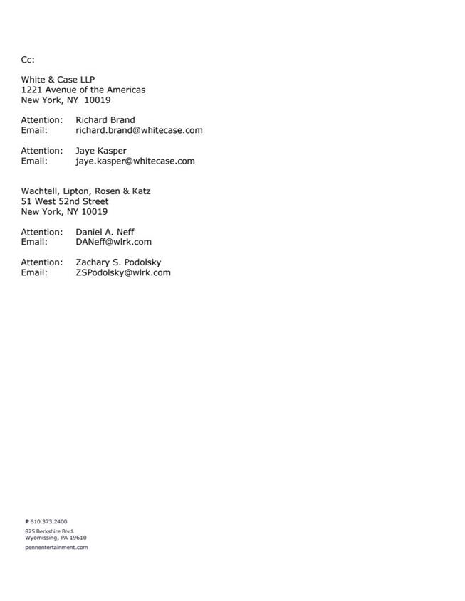 P 610.373.2400825 Berkshire Blvd. Wyomissing,PA 19610 pennentertainment.com CC:White & Case LLP 1221 Avenue of the Americas New York,NY 10019 Attention:Richard Brand Email:richard.brand@whitecase.com Attention:Jaye Kasper Email:jaye.kasper@whitecase.com Wachtell,Lipton,Rosen & Katz 51 West 52nd Street New York,NY 10019 Attention:Daniel A. Neff Email:daneff@wlrk.com Attention:Zachary S. Podolsky Email:ZSPodolsky@wlrk.com