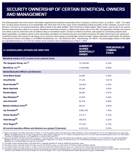 下表列出了截至2025年4月1日有关公司普通股实益所有权的某些信息。本表列出:(i)我们所知实益拥有公司任何类别已发行有表决权证券超过5%的每个人,(ii)我们的每位董事,(iii)下文题为“2024年薪酬汇总表”的表格中列出的我们的每位指定执行官,以及(iv)我们的所有现任董事和执行官作为一个整体。股份的实益所有权是根据SEC的规则确定的,通常包括个人对其行使单独或共享投票权或投资权的任何股份。除脚注中指出的情况外,并在适用的情况下遵守社区财产法,我们认为,根据提供给我们的信息,下表中列出的个人和实体对显示为他们实益拥有的我们普通股的所有股份拥有唯一的投票权和投资权。除非下文另有说明,否则表中所列人员的地址为c/o 佩恩国民博彩公司,825 Berkshire Blvd.,Wyomissing,PA 19610。本表显示的百分比是根据截至2025年4月1日我们已发行普通股的151,234,547股计算得出的。