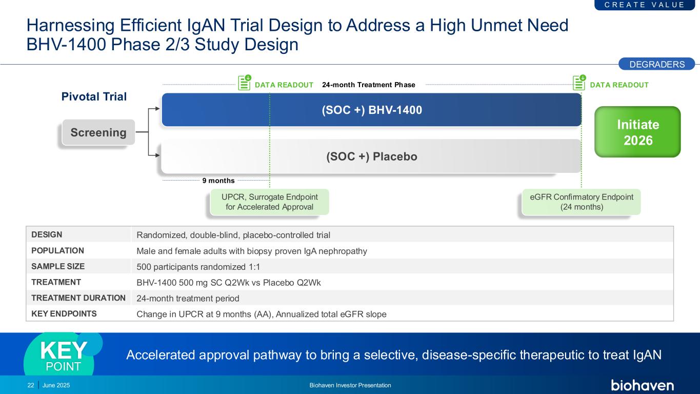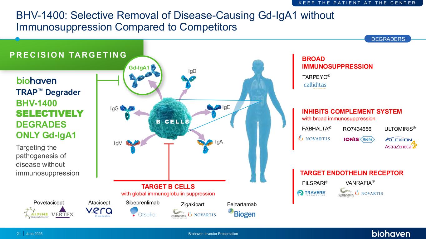P R E C是I O N TA R G E T在G BHV-1400中仅选择性降解GD-IGA1靶向疾病发病机制无免疫抑制靶点B细胞与全球免疫球蛋白抑制povetacicept Atacicept Sibeprenlimab Zigakibart Felzartamab BHV-1400:选择性去除致病GD-IGA1与竞争对手相比无免疫抑制的诱捕降解剂IGD IGM IGE IGA IGG GD-IGA1 B C E L L S Degraders K E E P T H E P A T I E N T A T H E C E N T E R 21抑制具有广泛免疫抑制FABHALTA的补充系统®RO7434656万拉菲亚®菲尔斯帕里®广泛免疫抑制TARPEYO®乌托米里斯®目标内皮素受体2025年6月Biohaven投资者说明会
