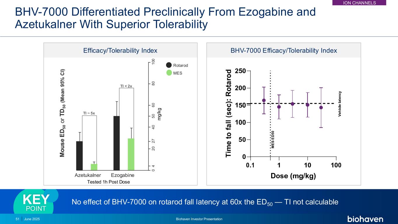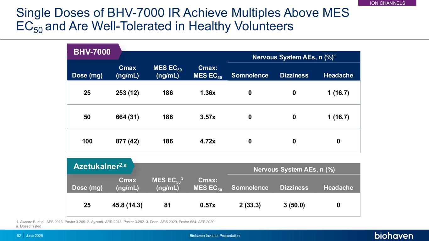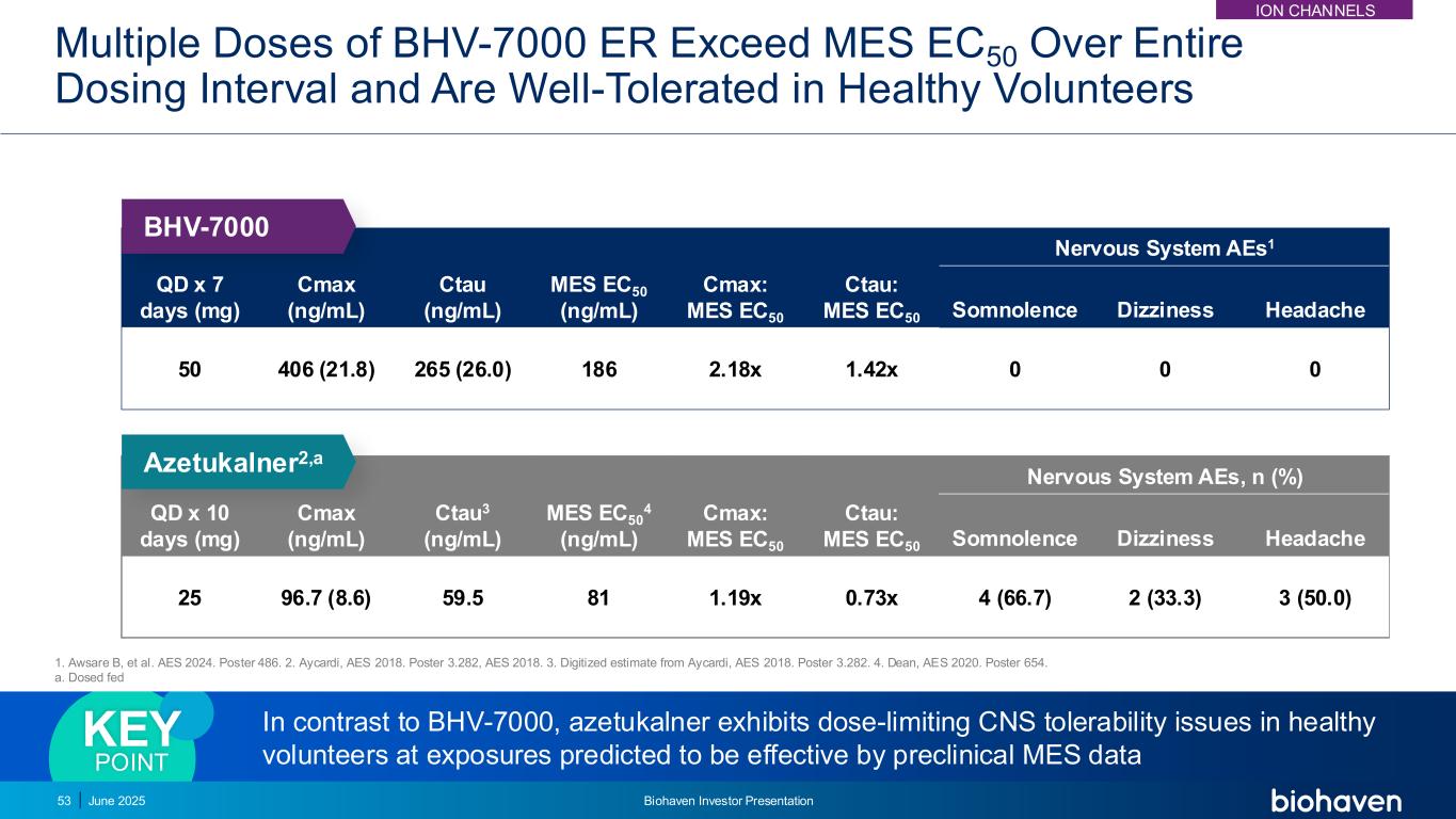 BHV-7000 IR单剂量达到MES EC50以上倍数,在健康志愿者中耐受性良好剂量(mg)Cmax(ng/mL)MES EC50 3(ng/mL)Cmax:MES EC50神经系统AEs,n(%)嗜睡头晕头痛2545.8(14.3)81 0.57x 2(33.3)3(50.0)0 Azetukalner2,a剂量(mg)Cmax(ng/mL)MES EC50(ng/mL)Cmax:MES EC50神经系统AEs,n(%)1嗜睡头晕头痛25253(12)1861.36x 001(16.7)50664(31)1863.57x 0Awsare B,et al. AES 2023。海报3.265。2.艾卡尔迪。AES 2018。海报3.282。3.迪安。AES 2020。海报654。AES 2020.a. Dosed Fasting 2025年6月52号Biohaven投资者说明会ION Channels