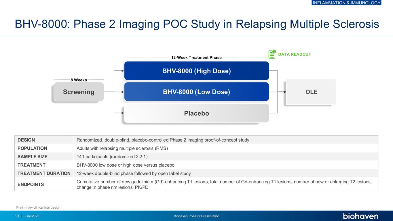 BHV-8000(高剂量)BHV-8000(低剂量)安慰剂筛查BHV-8000:复发性多发性硬化症的2期影像学POC研究初步临床试验设计设计随机、双盲、安慰剂对照的2期影像学概念验证研究人群成人复发性多发性硬化症(RMS)样本大小140名参与者(随机2:2:1)治疗BHV-8000低剂量或高剂量对比安慰剂治疗持续时间12周双盲阶段后开放标签研究终点累计新钆(GD)增强T1病变数量、GD增强T1病变总数、新增或扩大T2病变数量PK/PD 8周12周治疗阶段数据读出OLE炎症和免疫学2025年6月Biohaven投资者宣讲会91