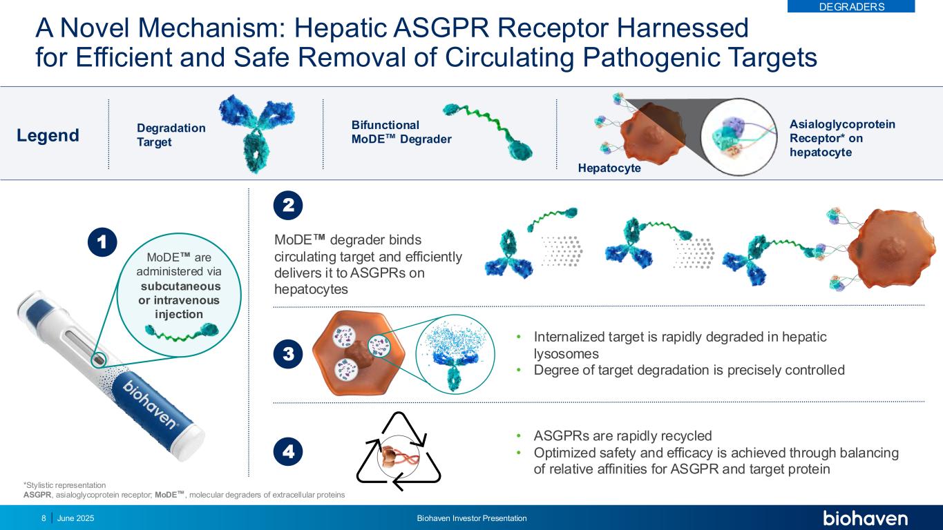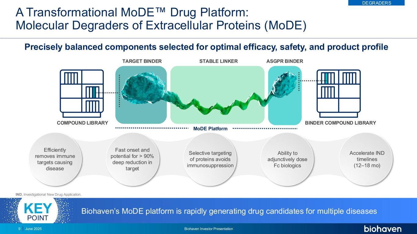一种新的机制:利用肝脏ASGPR受体高效、安全地清除循环致病靶点皮下或静脉注射MODES通过*文体表征ASGPR,去唾液酸糖蛋白受体;MODE,细胞外蛋白的分子降解剂•内化靶点在肝溶酶体中快速降解•靶点降解程度得到精确控制31传奇降解靶点双功能ModE降解剂亚洲糖蛋白受体*关于肝细胞• ASGPRs快速循环•通过平衡对ASGPR和靶蛋白的相对亲和力,实现优化的安全性和有效性4MODED降解剂结合循环靶点,并将其高效递送至肝细胞上的ASGPRs 2DEGRADERS肝细胞2025年6月Biohaven投资者介绍8