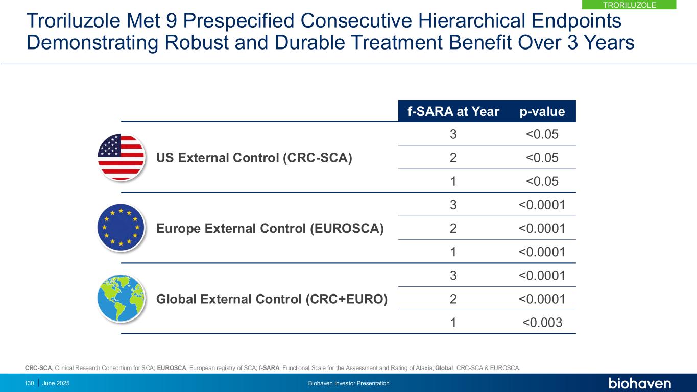 曲鲁唑达到9个预设的连续分级终点,证明在3年内具有稳健和持久的治疗益处f-SARA在p值年份美国外部控制(CRC-SCA)3 < 0.05 2 < 0.05 1 < 0.05欧洲外部控制(EUROSCA)3 < 0.00012 < 0.00011 < 0.0001全球外部控制(CRC + EURO)3 < 0.00012 < 0.00011 < 0.003 CRC-SCA,SCA临床研究联合体;EUROSCA,SCA的欧洲注册处;f-SARA,共济失调评估和评级功能量表;全球,CRC-SCA & EUROSCA。1302025年6月Biohaven投资者说明会特锐鲁唑