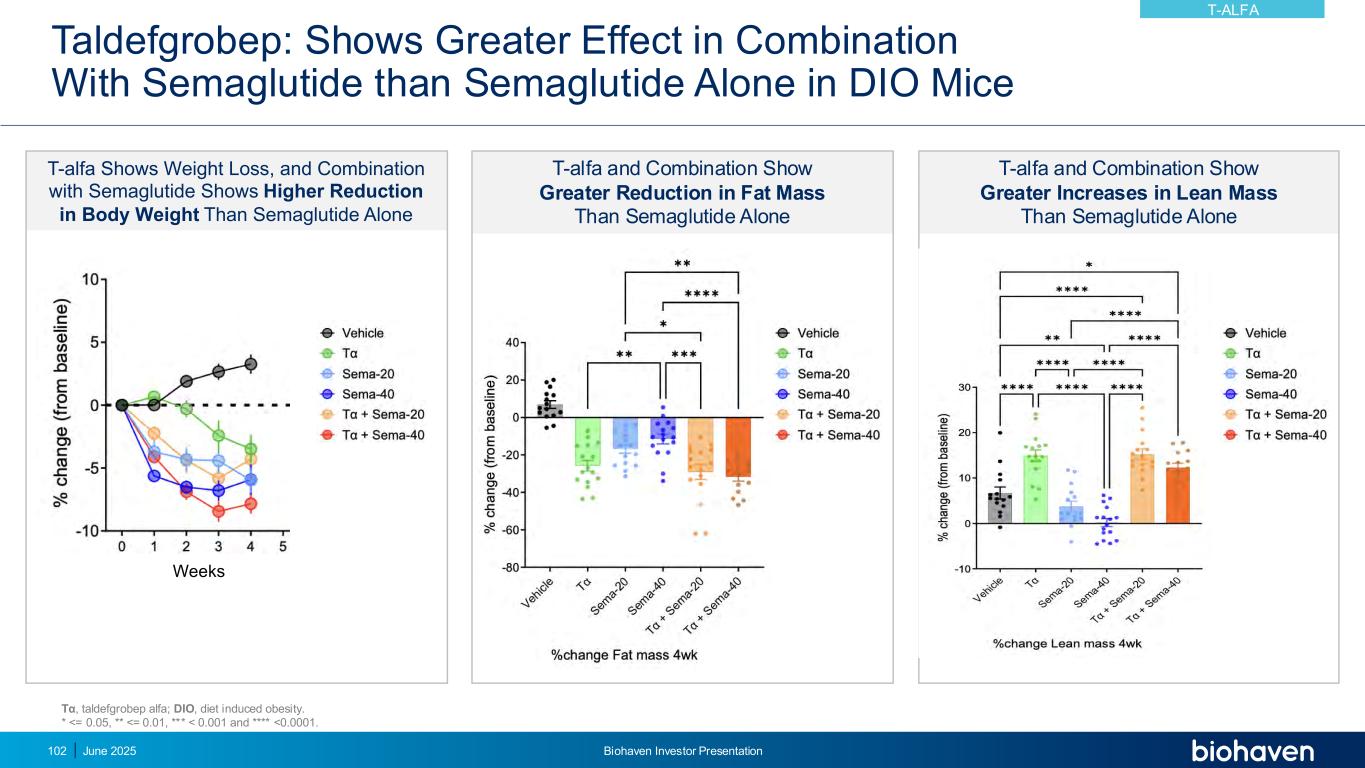 taldefgrobep:在DIO小鼠中与索马鲁肽联合使用显示出比单独使用索马鲁肽更大的效果T-alfa显示体重减轻,与索马鲁肽联合使用显示出比单独使用索马鲁肽更高的体重减轻周数T-alfa和联合使用显示出比单独使用索马鲁肽T-alfa和联合使用显示出比单独使用索马鲁肽T α、taldefgrobep alfa和联合使用显示出比单独使用索马鲁肽更大的精益质量增加;DIO、饮食诱导肥胖。*<= 0.05,**<= 0.01,***< 0.001和****<0.0001.T-ALFA 2025年6月Biohaven投资者说明会102