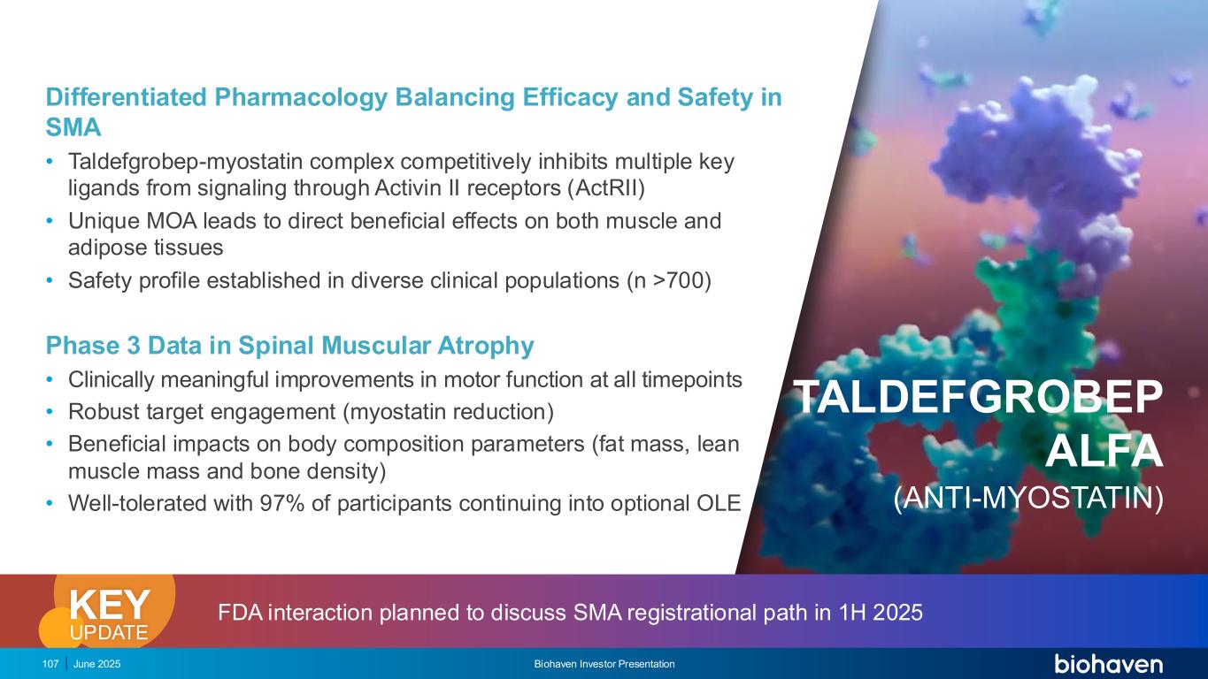 2025年6月Biohaven投资者介绍107 SMA中的差异化药理平衡功效和安全性• taldefrobep-肌肉抑制素复合体竞争性地抑制多个关键配体通过Activin II受体(ActRII)的信号传导•独特的MOA导致对肌肉和脂肪组织的直接有益影响•在不同临床人群中建立的安全性概况(n > 700)脊髓性肌肉萎缩的3期数据•在所有时间点的运动功能均有临床意义的改善•稳健的靶点参与(肌肉抑制素减少)•对身体成分参数的有益影响(脂肪量,瘦肌肉质量和骨密度)•耐受性良好,97%的参与者继续选择OLE TALDEFGROBEP ALFA(抗肌动蛋白)FDA互动计划在2025年1月讨论SMA注册路径关键更新