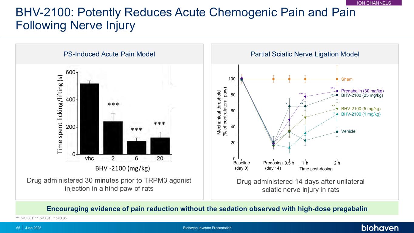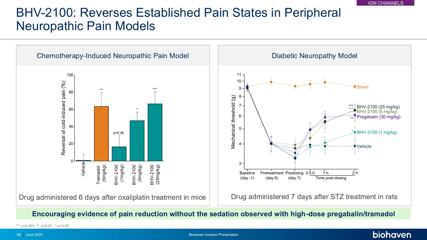 BHV-2100:强效减轻急性致化性疼痛和神经损伤后的疼痛令人鼓舞的证据表明,在大鼠后爪注射TRPM3激动剂30分钟前给药的大剂量普瑞巴林药物观察到的镇静情况下,疼痛减轻14天给药的药物大鼠单侧坐骨神经损伤后020406080100*************车用BHV-2100(1 mg/kg)BHV-2100(5 mg/kg)BHV-2100(25 mg/kg)普瑞巴林(30 mg/kg)2 h1 h0.5 h预给药(第14天)m e c h a n ic a l th re s h o ld(% o f c o n tr a la te ra l p a w)基线(第0天)给药后时间Sham***PS诱导的急性疼痛模型部分坐骨神经结扎模型***p < 0.001,**p < 0.01,*p < 0.05 ION CHANNELS 2025年6月Biohaven投资者说明会65
