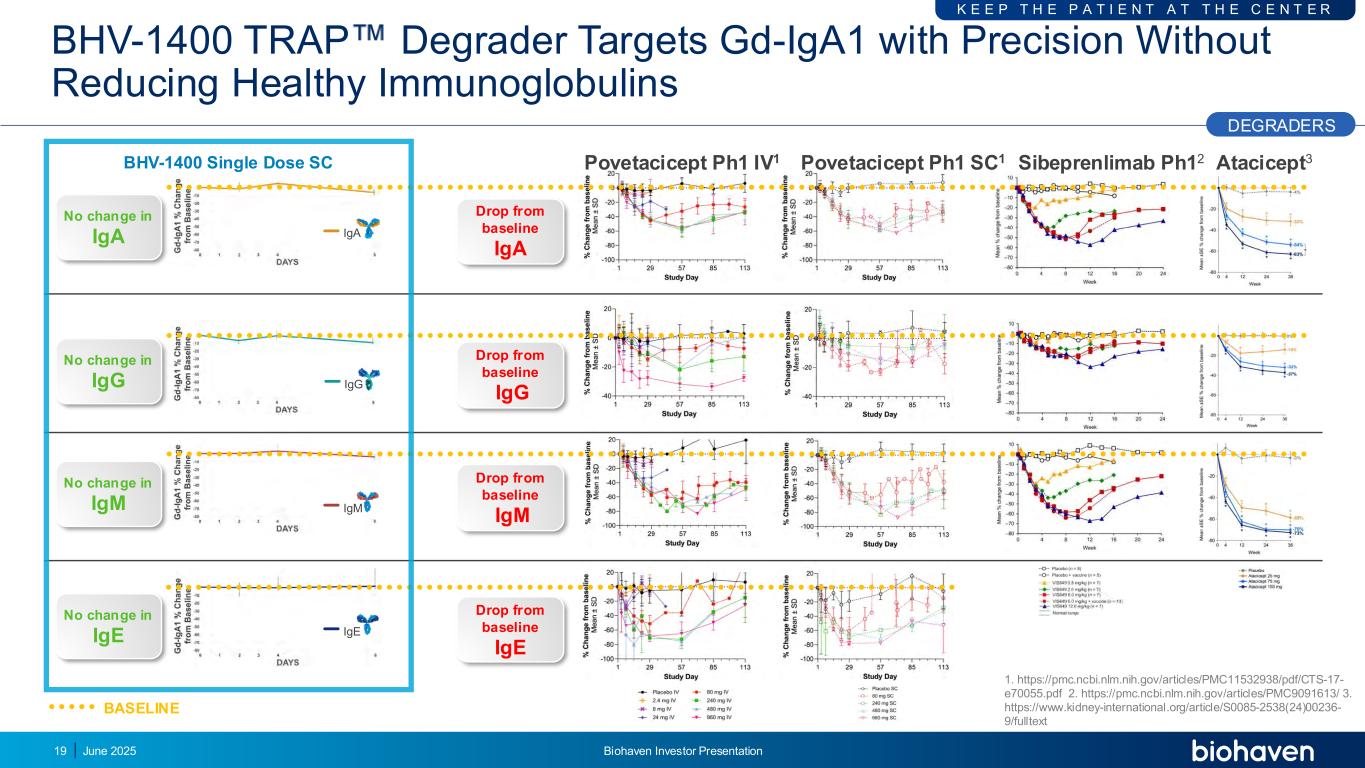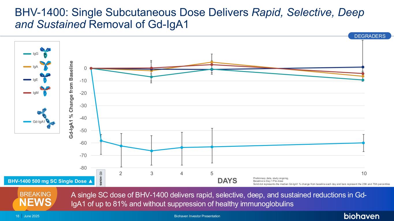 -80-70-60-50-40-30-20-10 0 BHV-1400:单次皮下给药可快速、选择性、深度和持续去除GD-IGA1 G D-I G A1 % C h a n g e f ro m B a s e li n e igG IgA IGE IGM Gd-IGA1 18天2345108 H O U R S DEGRADERS June 2025 Biohaven投资者介绍单次SC剂量的BHV-1400可快速、选择性、深度和持续地降低GD-IGA1高达81%,且不抑制健康的免疫球蛋白NEWS breaking初步数据,研究正在进行中,基线是第1天给药前实心点代表每天与基线相比的GD-IGA1 %中位数变化,条代表第25和75个百分位BHV-1400 500 mg SC单剂量▲