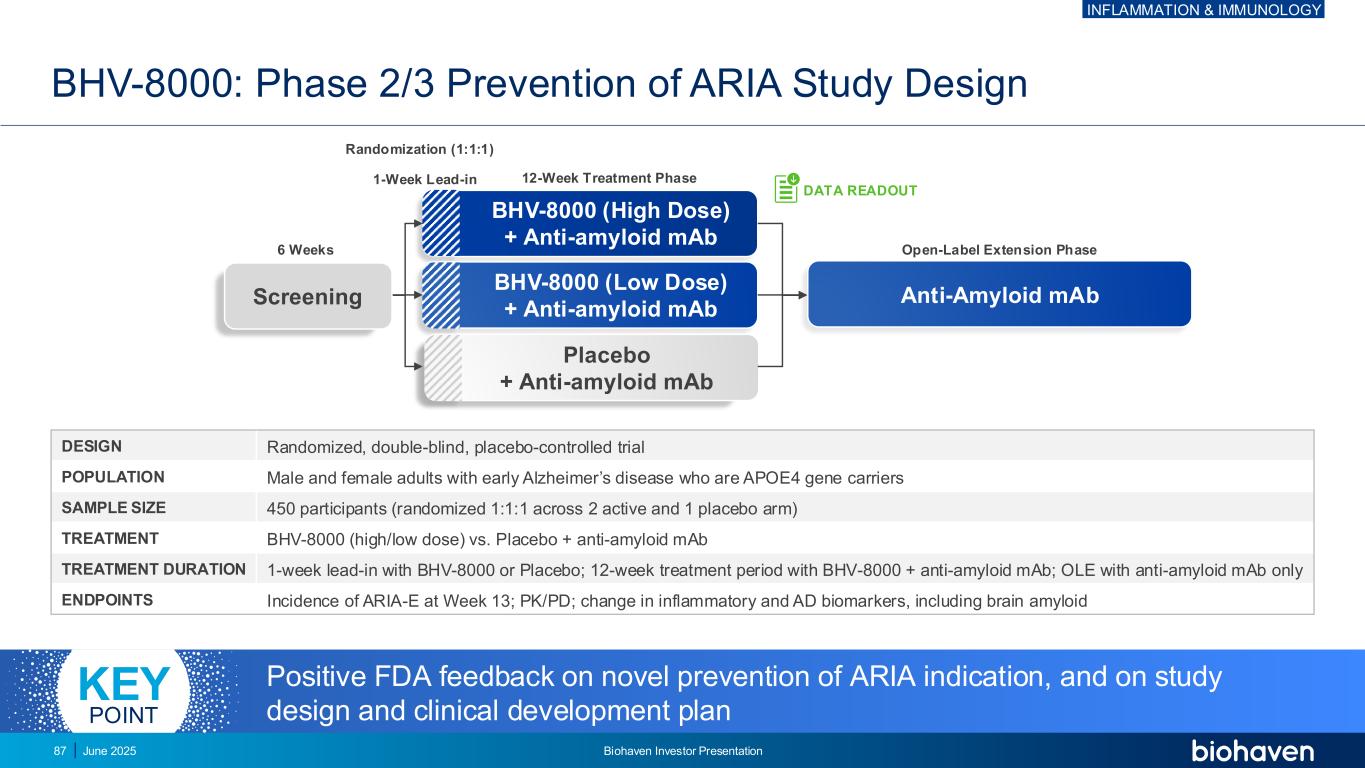 抗淀粉样mAB BHV-8000(高剂量)+抗淀粉样mAB BHV-8000(低剂量)+抗淀粉样mAB安慰剂+抗淀粉样mAB BHV-8000:2/3期预防ARIA研究设计随机、双盲、安慰剂对照试验人群APOE4基因携带者患有早期阿尔茨海默病的男性和女性成人样本大小450名参与者(随机1:1:1跨越2个活性组和1个安慰剂组)治疗BHV-8000(高/低剂量)vs.安慰剂+抗淀粉样蛋白mAB治疗持续时间1周导入BHV-8000或安慰剂;BHV-8000 +抗淀粉样蛋白mAB治疗期12周;OLE与抗淀粉样蛋白mAB仅终点ARIA-E在第13周的发病率;PK/PD;炎症和AD生物标志物的变化,包括脑淀粉样蛋白12周治疗1周导入随机化(1:以及关于研究设计和临床开发计划关键点筛查炎症与免疫学2025年6月Biohaven投资者说明会87