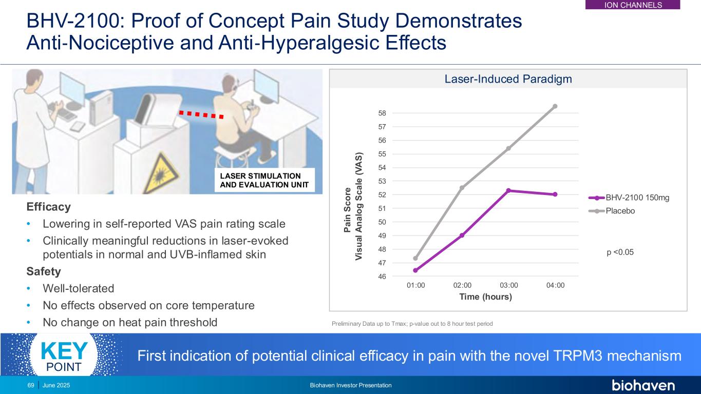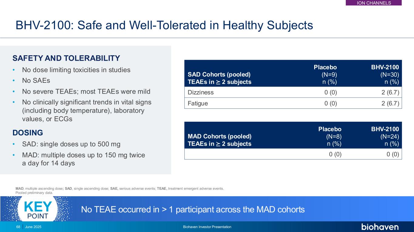 BHV-2100:在健康受试者中安全且耐受良好的安全性和耐受性•研究中没有剂量限制毒性•没有SAE •没有严重的TEAEs;大多数TEAEs是轻微的•在生命体征(包括体温)、实验室数值或心电图给药方面没有临床上显着的趋势• SAD:单次剂量最高500毫克• MAD:多次剂量最高150毫克每天两次,持续14天MAD,多次递增剂量;SAD,单次递增剂量;SAE,严重不良事件;TEAEs,治疗出现不良事件。汇集初步数据。SAD队列(集合)TEAEs在2受试者中的安慰剂(N = 9)n(%)BHV-2100(N = 30)n(%)头晕0(0)2(6.7)疲劳0(0)2(6.7)MAD队列(集合)TEAEs在2受试者中的安慰剂(N = 8)n(%)BHV-2100(N = 24)n(%)0(0)0(0)MAD队列中> 1参与者未发生TEAEs关键点ION Channels 2025年6月Biohaven投资者宣讲会68