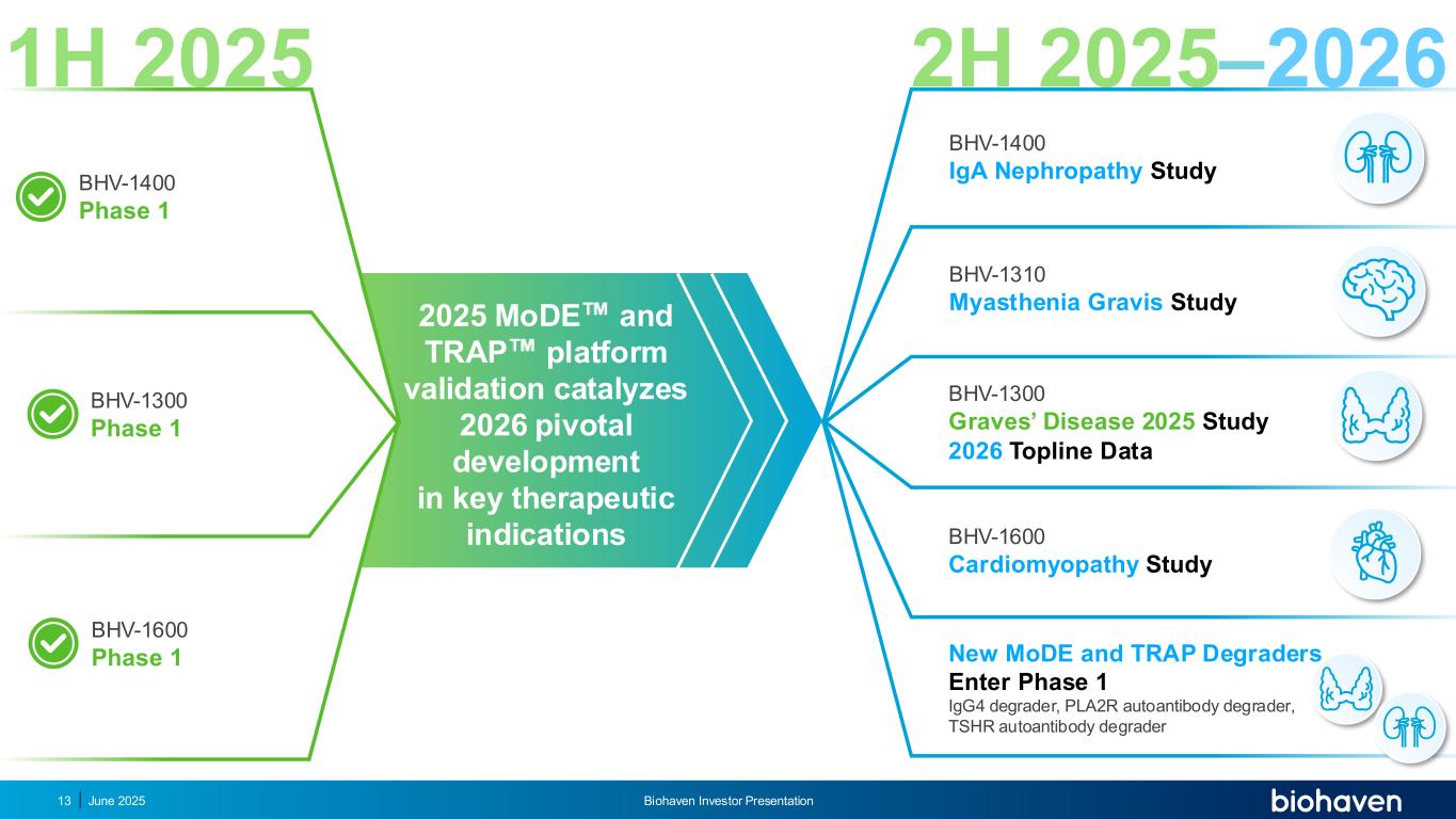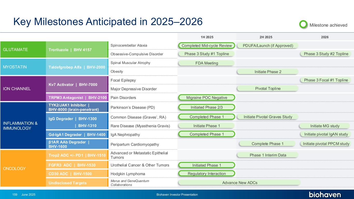 1H 2025 2H 20252026谷氨酸曲鲁唑| BHV 4157棘小脑共济失调强迫症肌促抑素taldefgrobep alfa | BHV-2000脊髓肌萎缩性肥胖ION通道KV7激活剂| BHV-7000局灶性癫痫重度抑郁症TRPM3拮抗剂| BHV-2100疼痛障碍炎症和免疫学TYK2/JAK1抑制剂| BHV-8000(脑穿透性)帕金森病(PD)IGG降解剂| BHV-1300 | BHV-1310常见病(Graves ',RA)罕见病(重症肌无力)GD-IGA1降解剂| BHV-1400 IgA肾病β 1AR AAb降解剂| BHV-1600围产期心肌病肿瘤学Trop2 ADC +/-PD1 | BHV-1510晚期或转移性上皮瘤FGFR3 ADC | BHV-1530尿路上皮癌&其他肿瘤CD30 ADC | BHV-1500霍奇金淋巴瘤未公开靶点Merus与GeneQuantum合作的3期研究# 1顶线FDA会议关键顶线完成1期完成1期启动1期完成1期启动1期完成1期中期数据监管交互关键里程碑预计在2025 – 2026年PDUFA/启动(如果获得批准)完成中周期审查启动2/3阶段启动2期3期研究# 2顶线启动Pivotal Graves研究启动关键IgAN研究启动1期3期焦点# 1顶线启动关键PPCM研究启动MG研究推进新ADCs 2025年6月偏头痛POC阴性Biohaven投资者介绍159里程碑实现